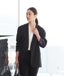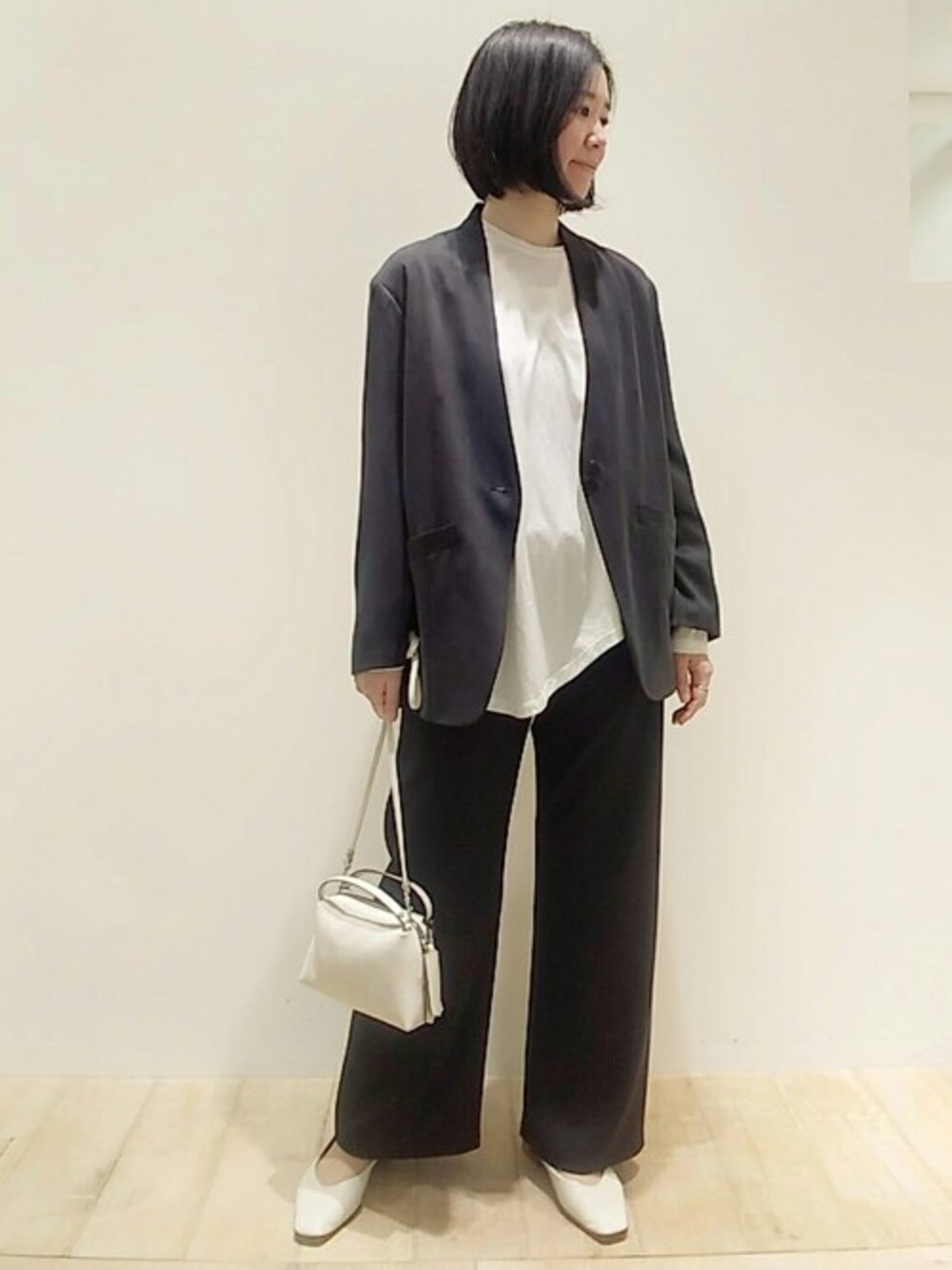 スミクロのやわらかいブラックカラーが魅力のジャケットにアシンメトリーのカットソーを合わせたモノトーンコーデ。セミフレアパンツを合わせてかっちりしすぎないジャケットスタイルに!