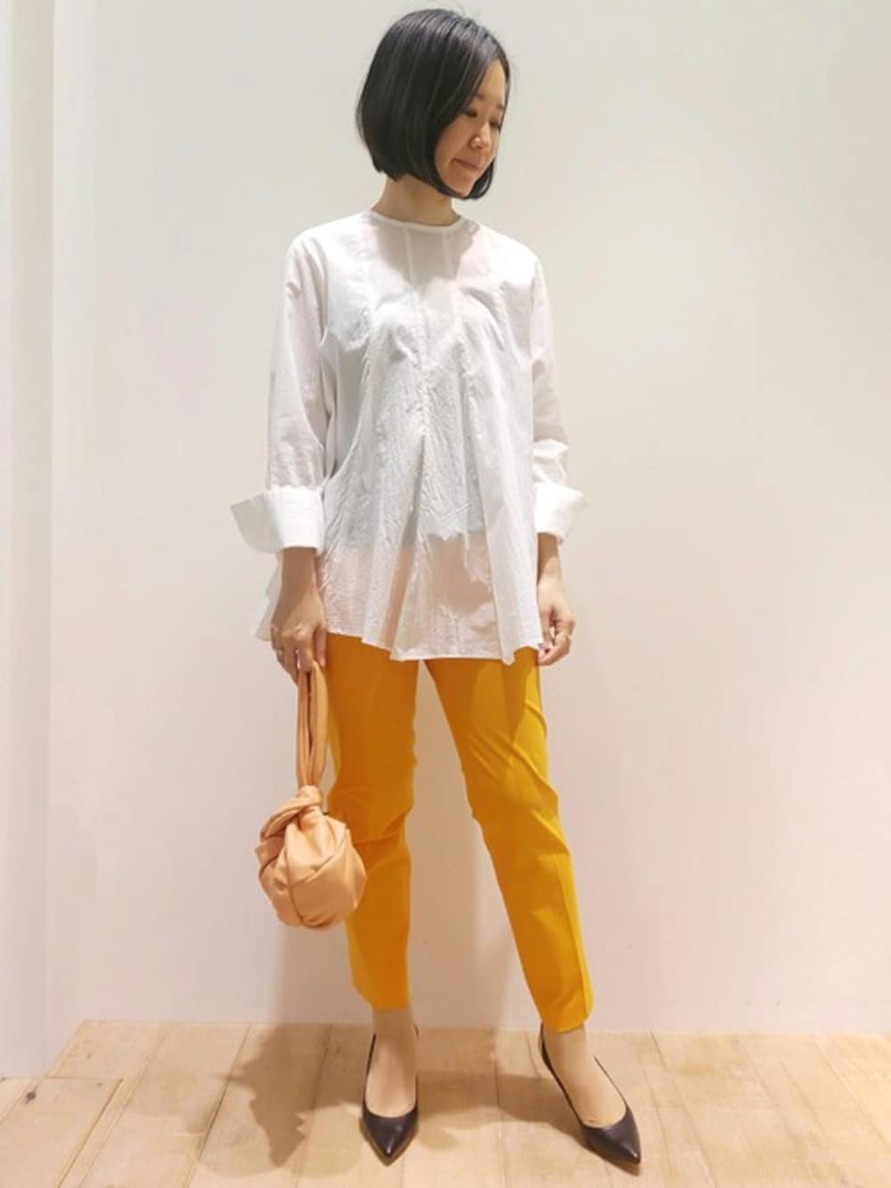 1枚でも着映えするシャツブラウスに、オレジカラーのシガレットパンツを合わせました!華やかなオレンジが惹きつけられるカラーパンツコーディネートです。