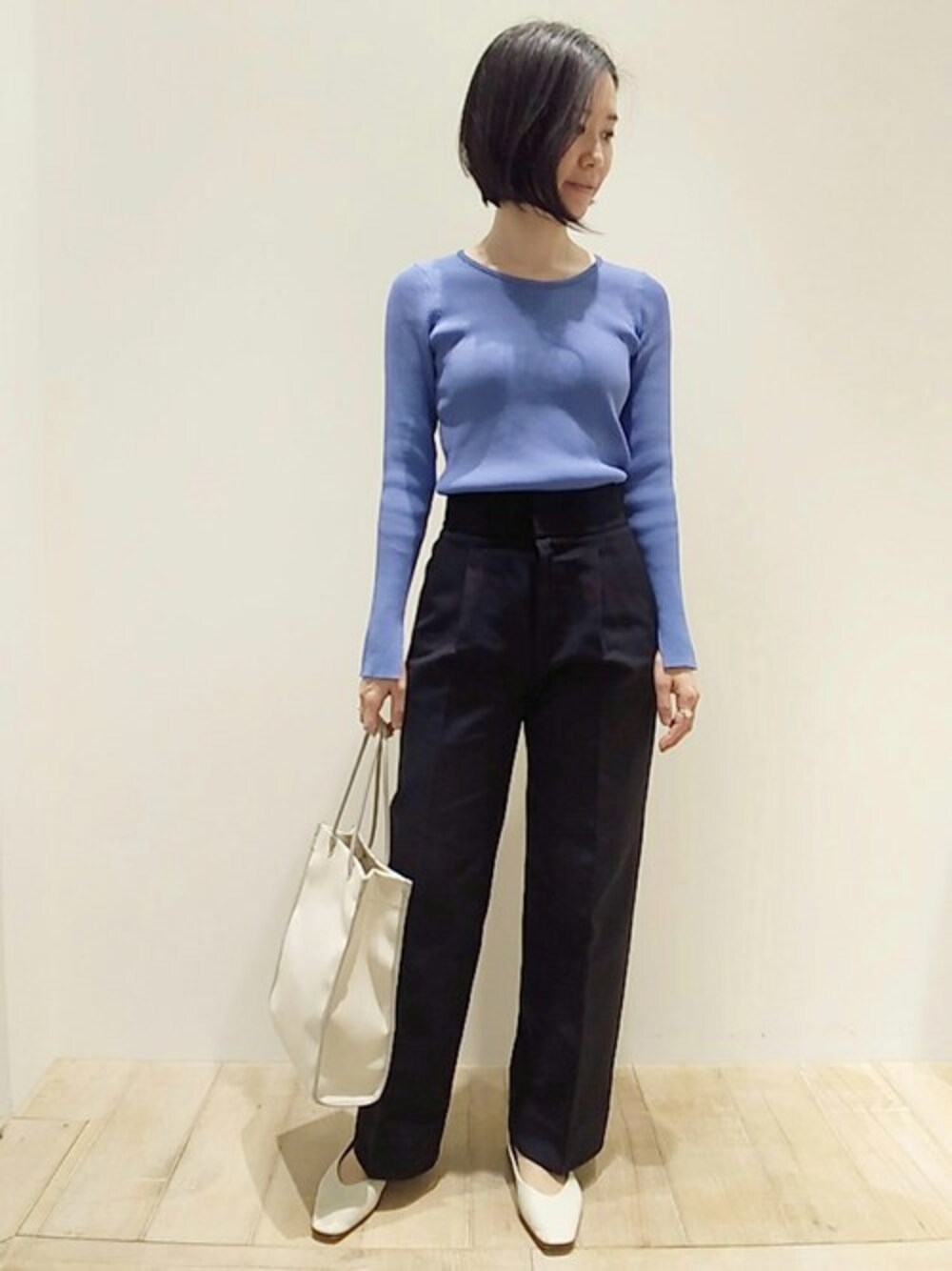 鮮やかなブルーカラーがポイントのリブニットプルオーバーに、2重織りコットンパンツを合わせました!パンツはボディラインを拾わないハイウエストシルエットで、リブニットと合わせるとすっきりとした印象になります!
