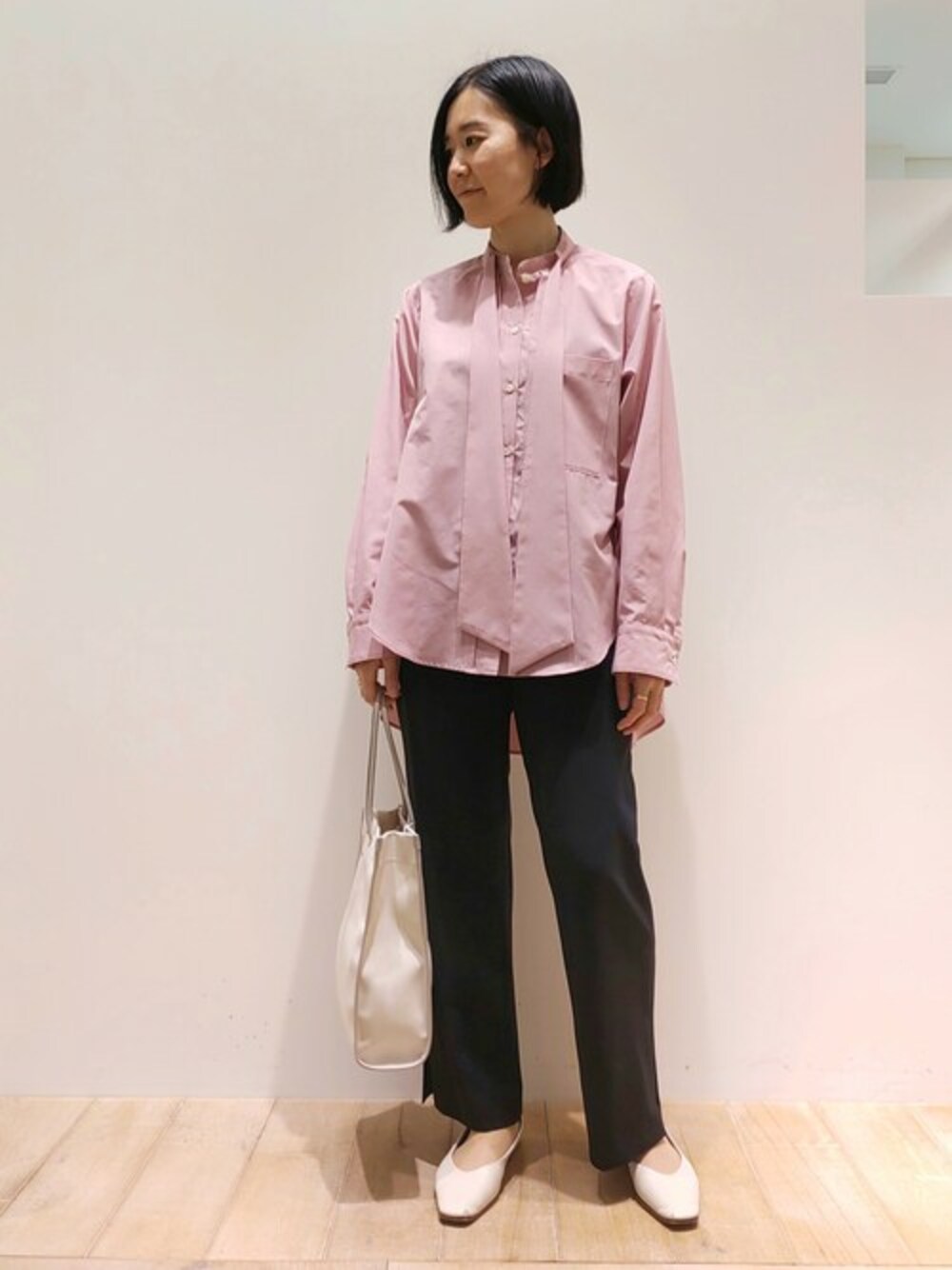 ボウタイシャツと、イージーなはき心地のスリットパンツを合わせました!印象的なボウタイはメンズライクなボックス型のシルエットで、1枚で着映えするアイテムです。