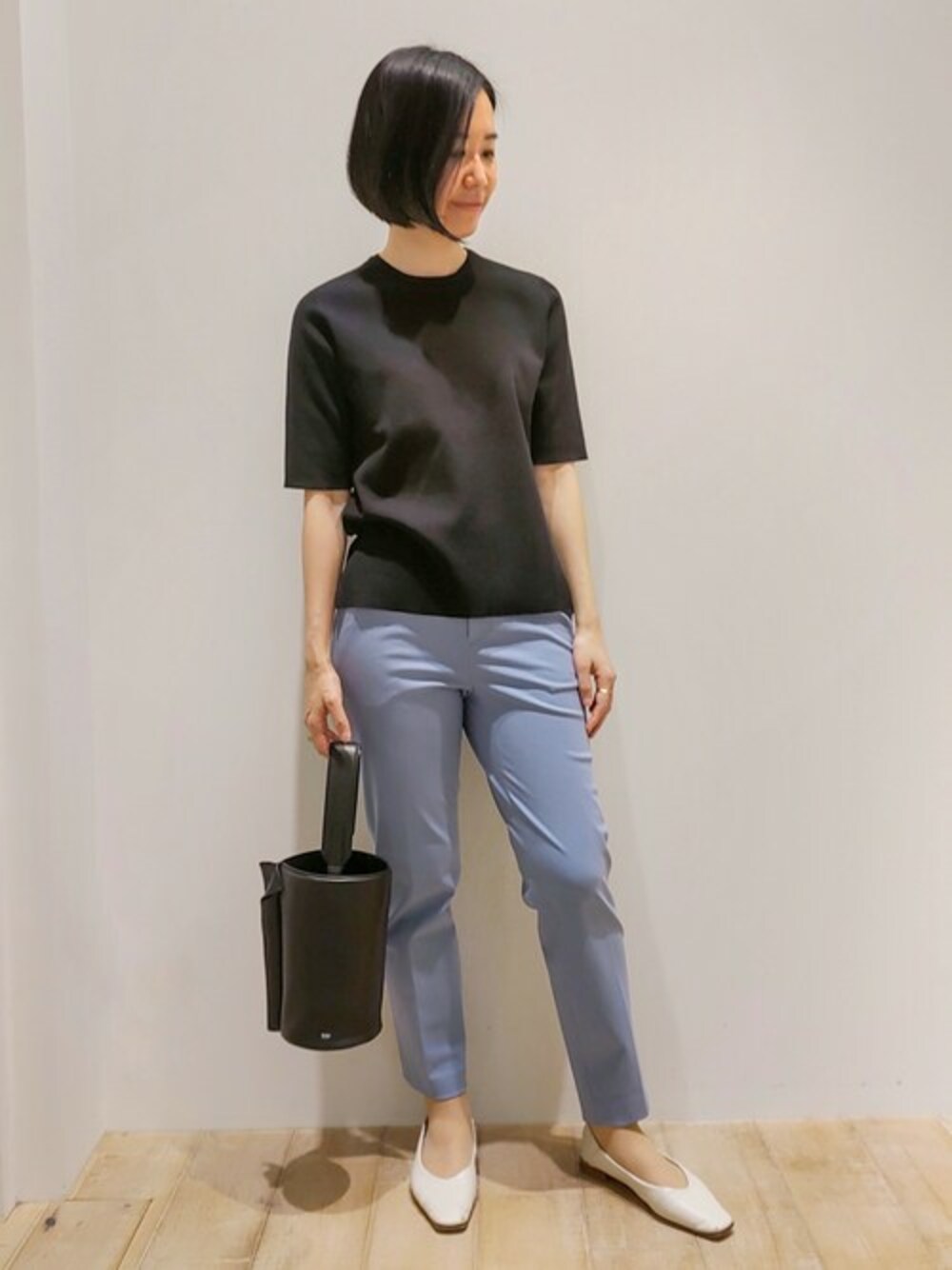 優しいブルー色のカラーパンツに、ブラックのリブニットを合わせました!シンプルなスタイルをカラーで春を表現。パンツはストレッチ生地でとてもはきやすいです。