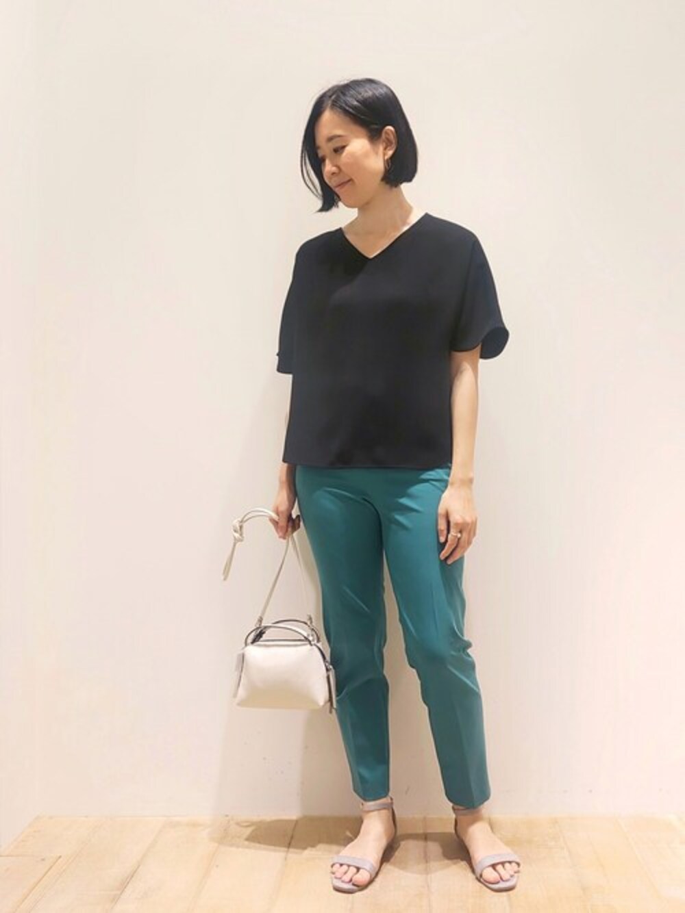ブラックのとろみのあるブラウスに鮮やかなブルーカラーパンツを合わせました。トップスやサンダルは、ベーシックカラーで整えて、カラーパンツをより際立たせるコーディネート!