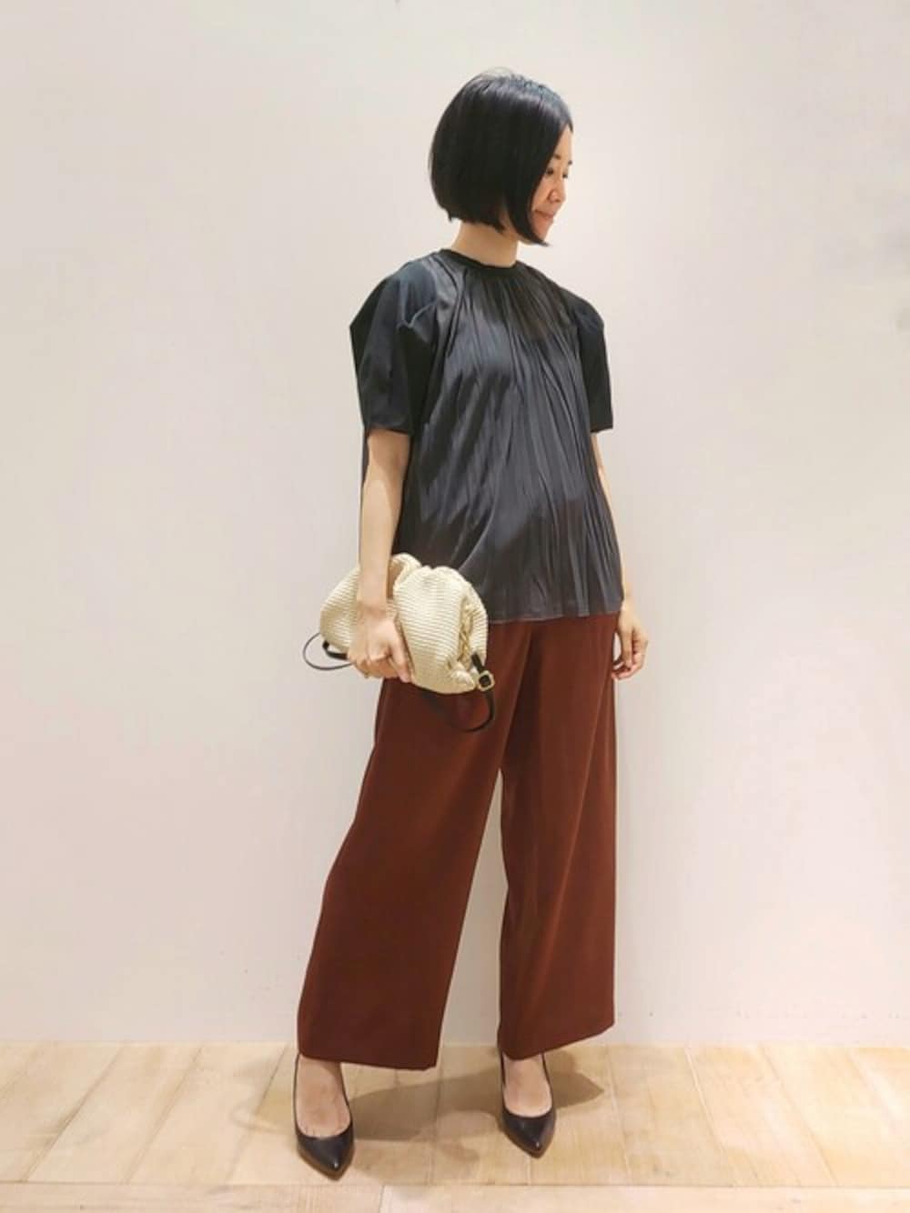 リラックス感のあるワイドパンツにプリーツブラウスを合わせました! リネンのような生地のワイドパンツで、夏らしい素材です。