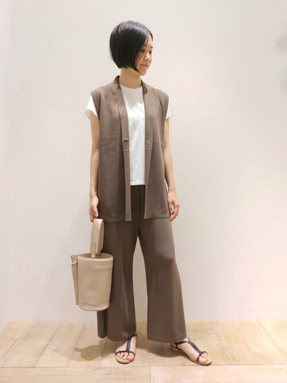 ニットジレと、ニットパンツのセットアップコーディネート。見た目より薄くひんやりとした涼しいサマーニット。オフィスカジュアルにも◎リラックス感のある着心地です!
