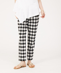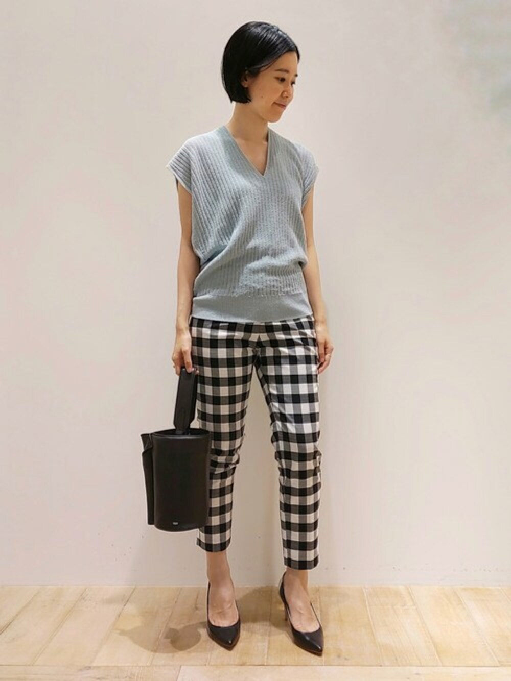 大きなギンガムチェック柄が印象的なパンツは、カリテの定番になりつつあるハイウエストテーパードパンツ!ウエストがゴムではきやすい、美脚パンツです。爽やかにブルーカラーのニットと合わせました。