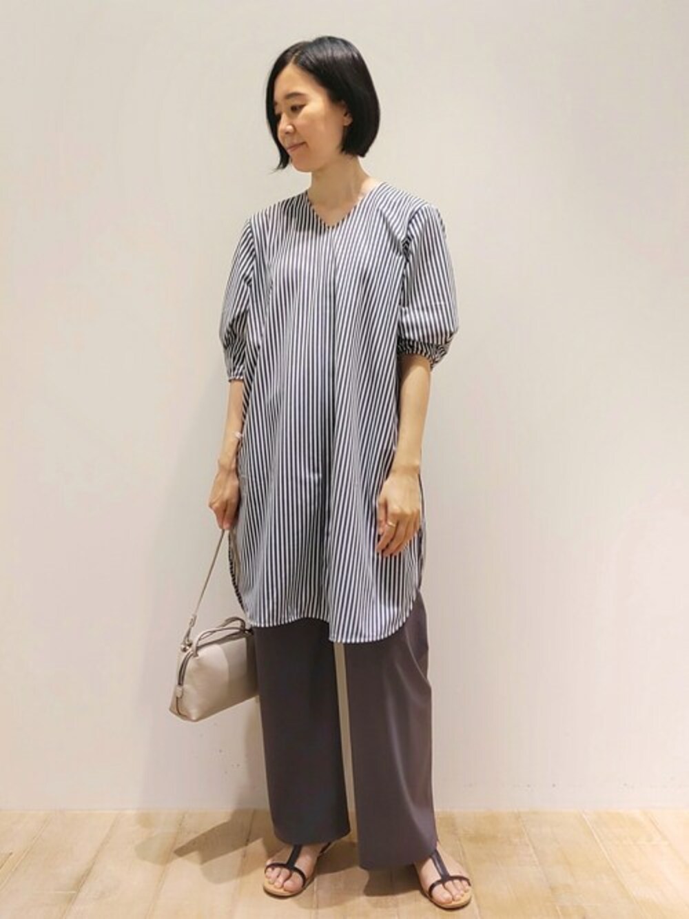 ロングカットソーに、レギンスパンツを合わせました!チュニック丈の1枚着、ストライプ柄ですっきりしたイメージです。