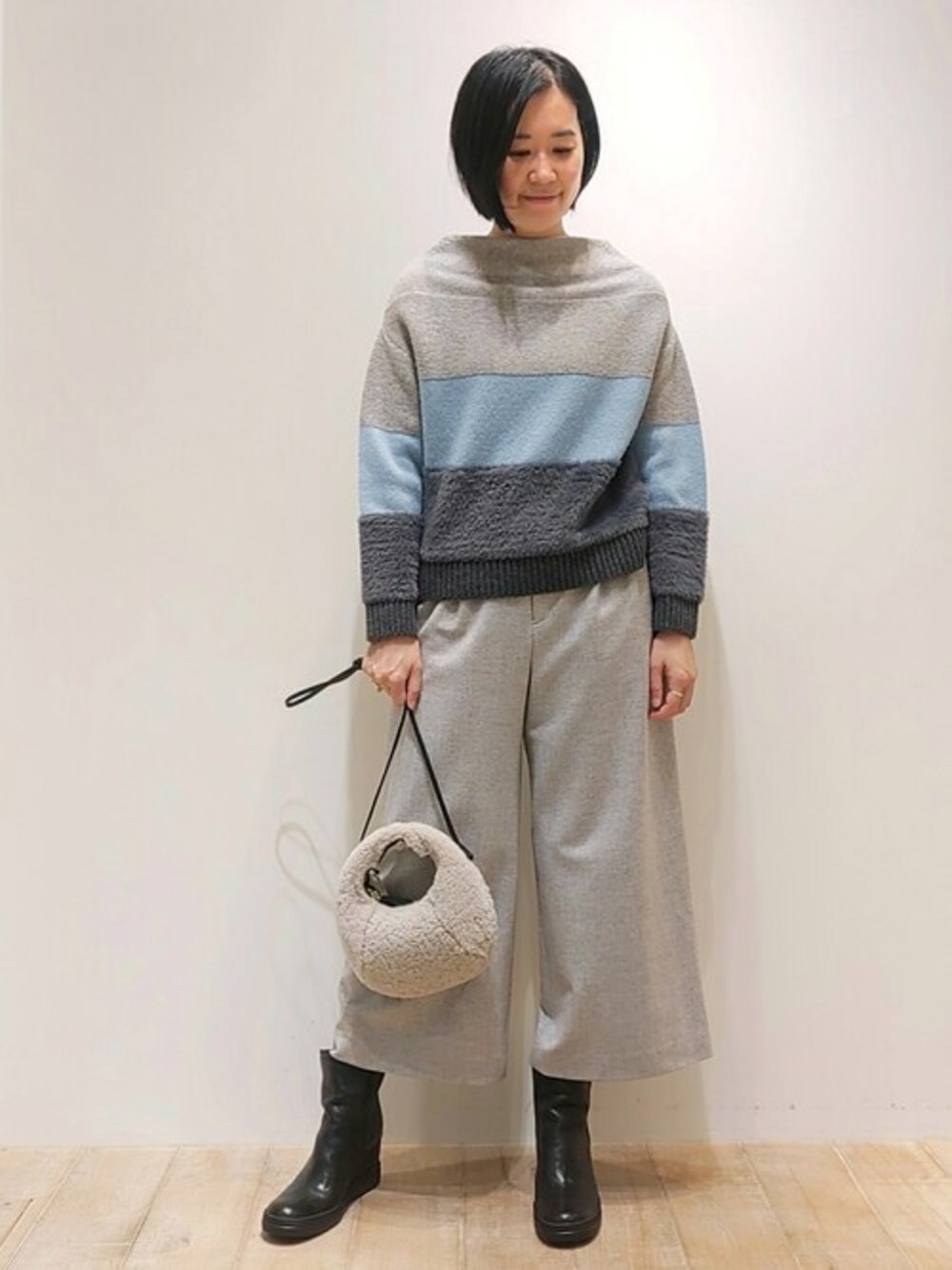 ブルーやグレーのカラーブロックがきれいなニットに、クロップドワイドパンツを合わせました。 パンツをよく見ると、イエローやブルーの細かい糸が組み合わせている美しい生地。 合わせるトップスの色合いで、パンツの色が変化するようにうつります。