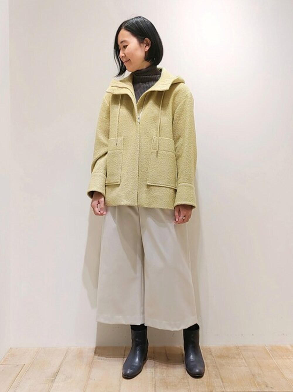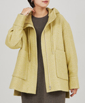 ゆったりとしたシルエットのツイードフードコート。 冬のコーディネートをイエローカラーでトーンUp! 大人のカジュアルスタイルです。