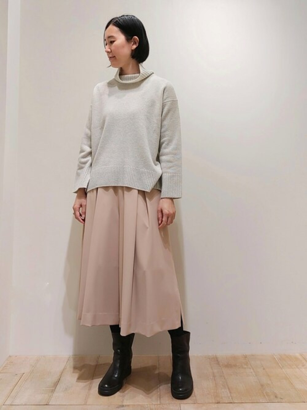 ライトグレーのオフタートルニットにピンクカラーのフレアパンツを合わせました。フレアスカートをはいているようなシルエットのパンツ、フェミニンなパンツコーディネートです!