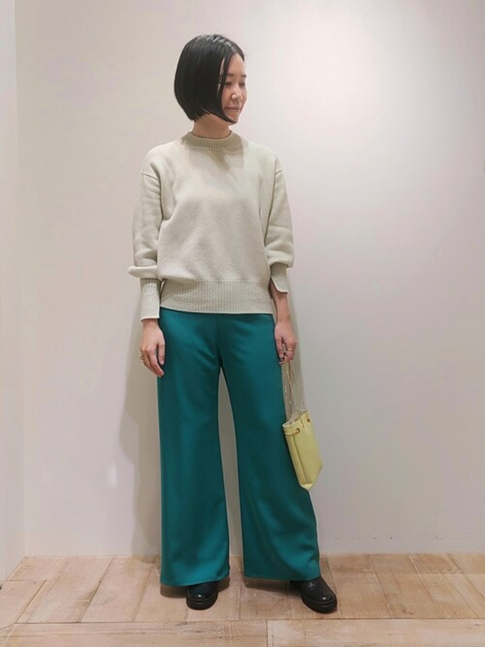 ライムカラーのクルーネックニットに、ブルーのサテンパンツを合わせました!コンパクトなクルーネックニットは、柔らかいウルグアイウール。肌触り抜群で、とてもあたたかく機能性も優れたニットです。
