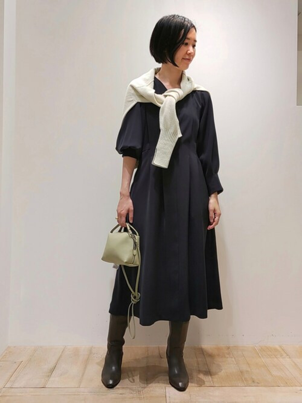 自然ときれいなフォルムでお召し頂けるワンピース。 式典やお仕事にもオススメですが、ブーツと肩掛けニットで普段着用にコーディネートしてみました!