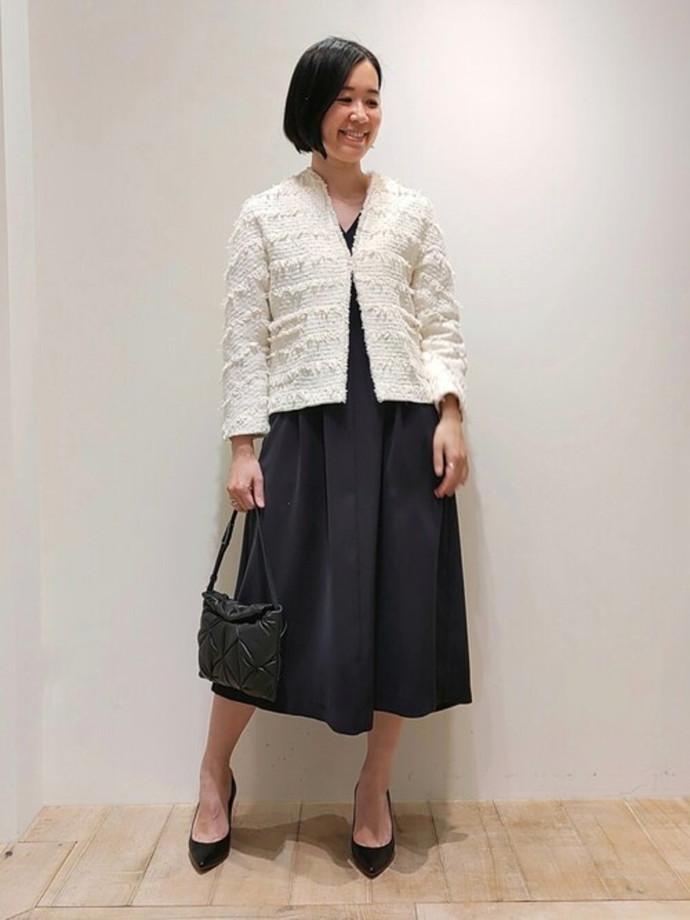 入学式や卒業式、結婚パーティーなどにオススメなコーディネート!羽織るだけで様になるツィードジャケットをアクセントに、フェミニンな雰囲気なスタイリングに仕上げました。