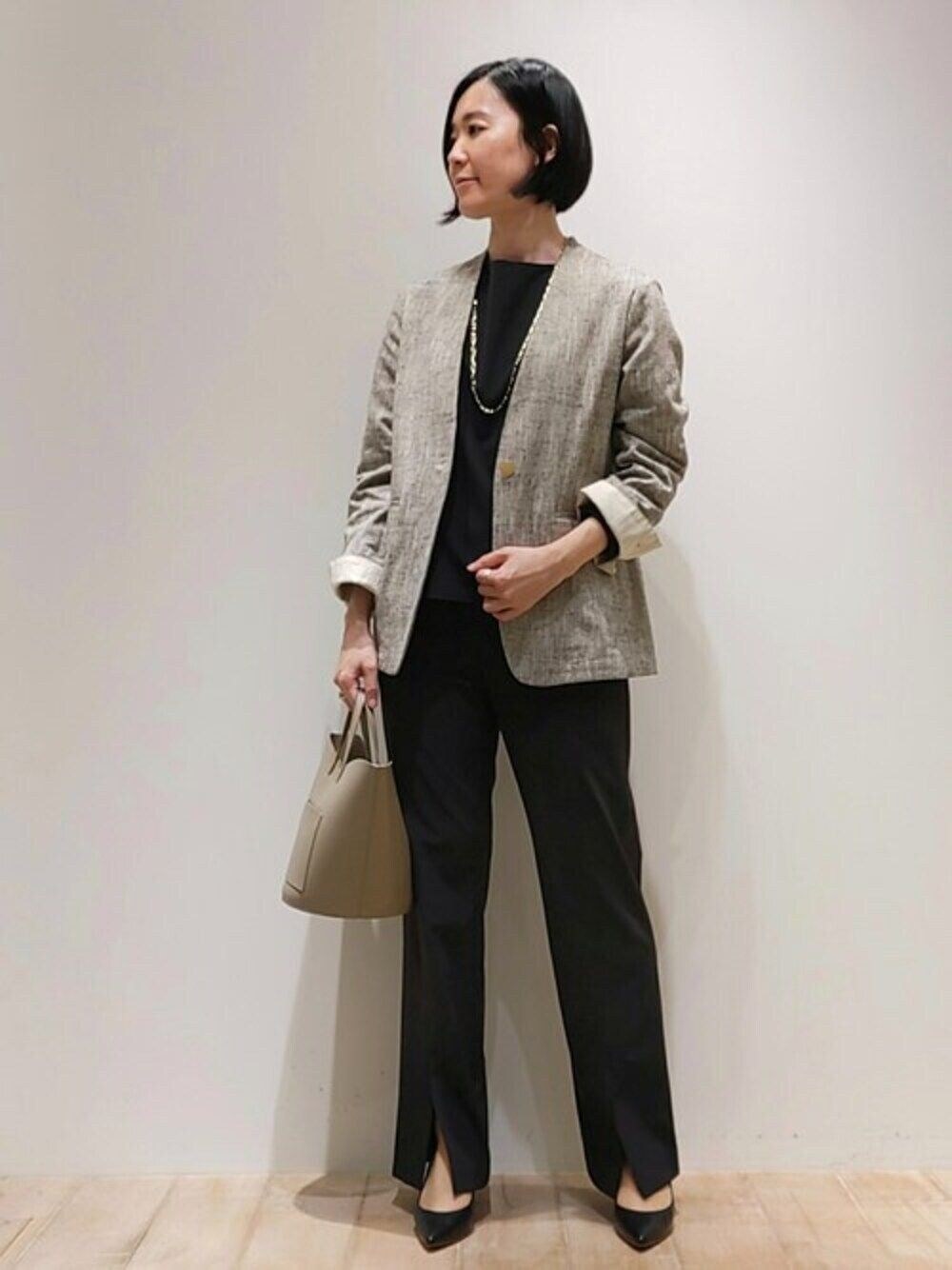 カリテの定番、2WAYストレッチシリーズのセットアップにノーカラージャネットを合わせました! マニッシュなお仕事コーデ。