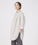 スタンドカラーのロングシャツにワイドストレートパンツを合わせました。 グレーの濃色淡色コーディネート!