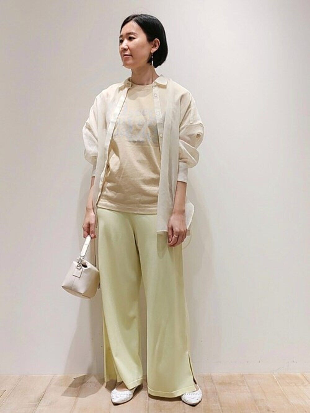 イエローのニットパンツに、ロゴT、シアーシャツを合わせました! ニットパンツはとてもリラックス感のあるデザイン、サイドスリットで軽やかさもあります。サラッとしていて夏も涼しい素材です。
