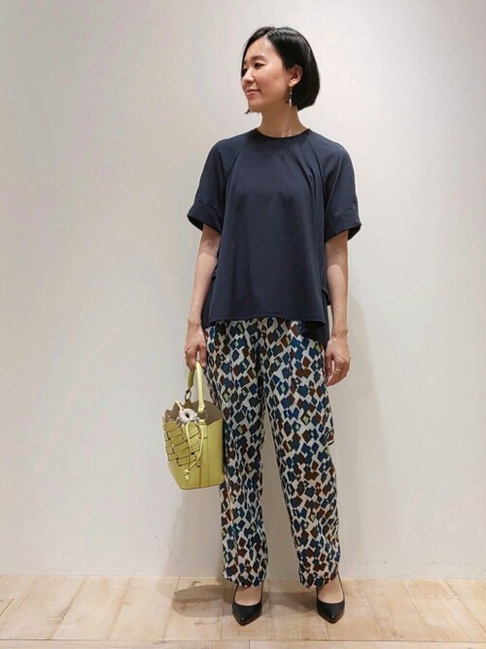 カリテオリジナルのダイヤ柄パンツ! 柄のインパクトもありますが、腰回りゆったりで、カバー力がとてもある形状のパンツです。 ネイビーカラーのカットソーと合わせて休日のお出かけスタイル!