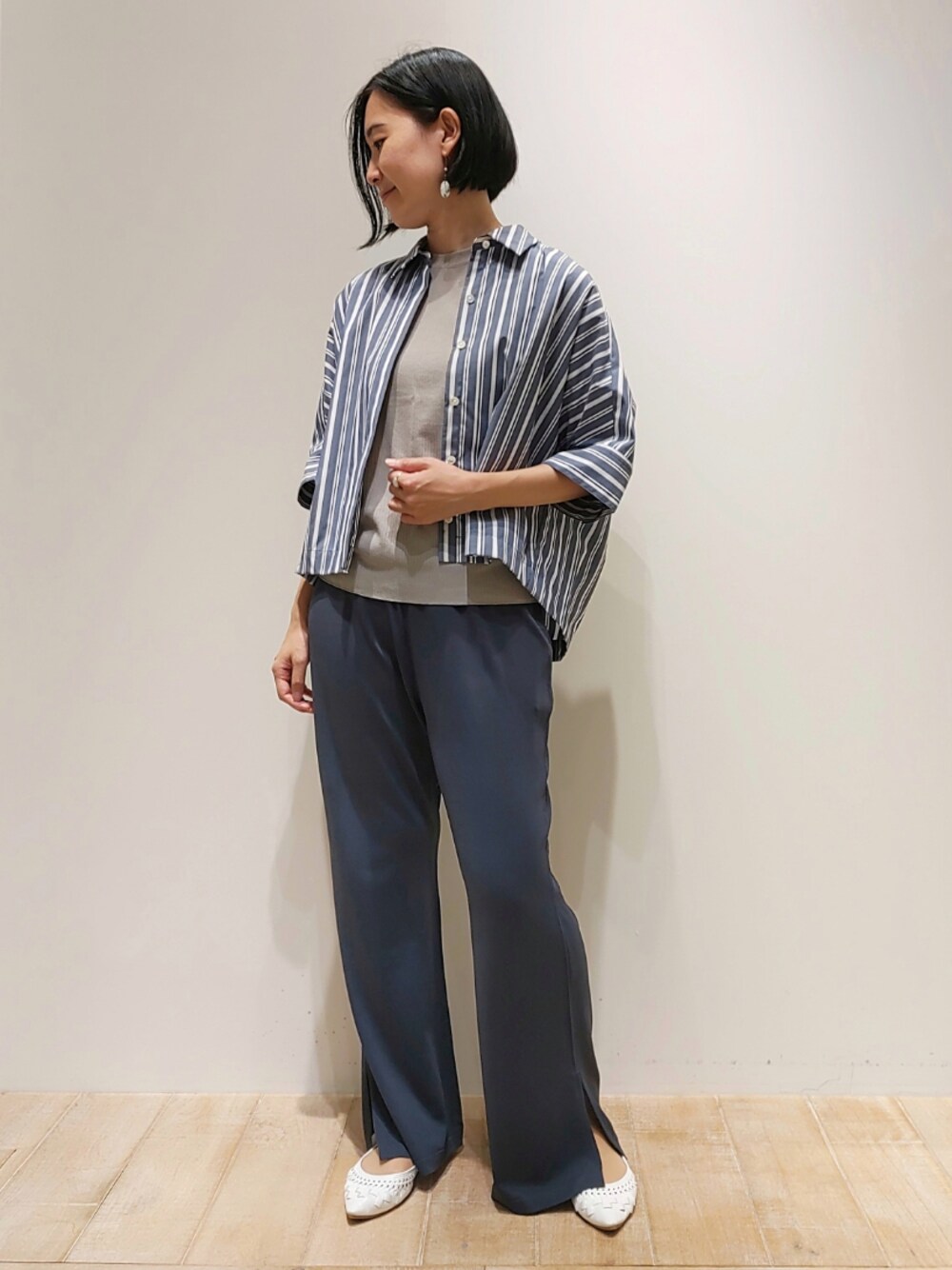 ストライプの爽やかなシャツコーデ。 ジャケット感覚でお召し頂けます。 パンツは夏でも涼しいニットパンツ!