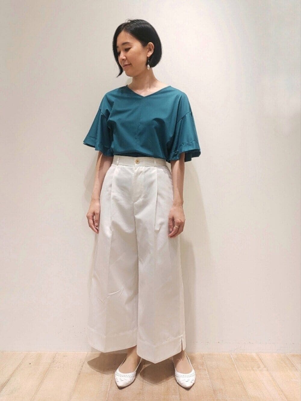 清涼感のあるブルー色がオススメなフレアスリーブカットソー! ワイドクロップドパンツにインしてウェストをスッキリ見せています。