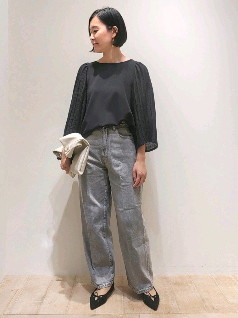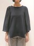 ボリュームのあるストライプ柄のスリーブが特徴的なブラウス。 身頃はもちっとした感覚の生地で着心地◎ フェミニンな要素もある異素材ミックスブラウスです。