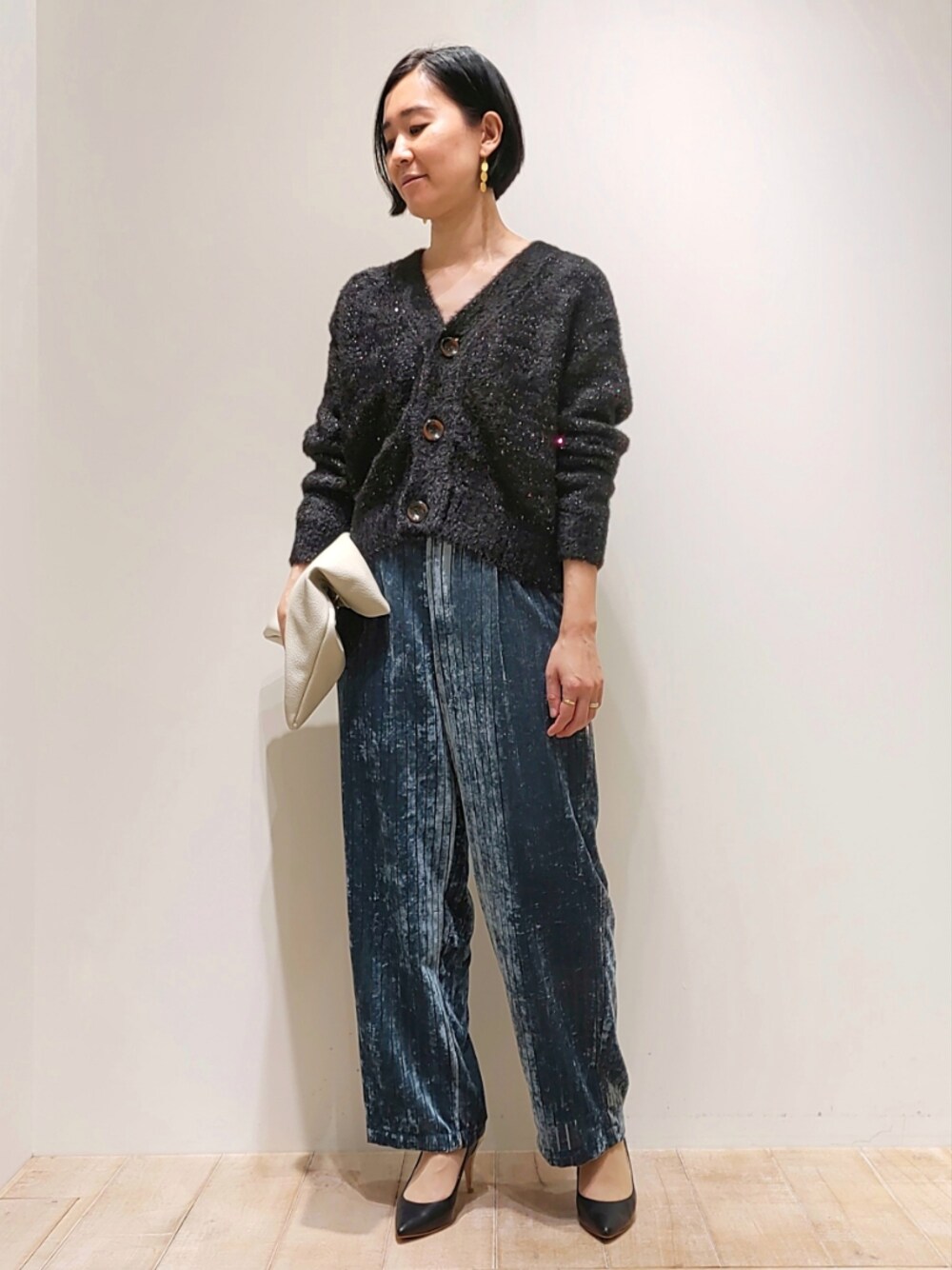 Chie(メゾン カリテ 新宿高島屋店)のカーディガン/ボレロ「【boussole×qualite】スパンコールフェザーカーディガン」を使ったコーディネート