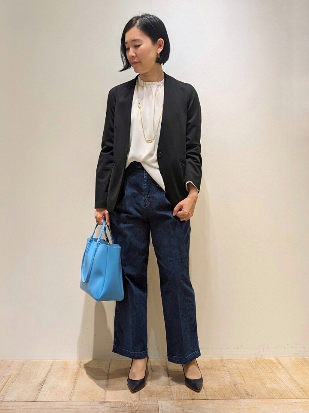 いつもご覧いただきありがとうございます! デニムを取り入れたジャケットコーデ! タックの入ったワイドストレートパンツですっきりと履けます。