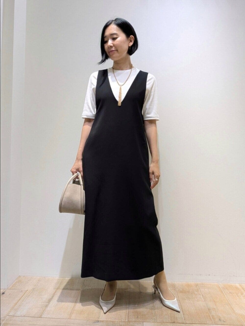 [プロフィール] 身長:164cm 骨格ウェーブ・ブルベ夏 普段サイズ:トップス38/ボトム38〜40 [qualite]ナローロングワンピース 着用サイズ:38 細身な印象で着られるタイトシルエットのワンピース。腰回りはボディラインに添いすぎないので目立ちにくく、きれいなIラインですっきりした印象です。合わせるインナーでイメージに変化をつけられ、長い季節楽しめます。 [qualite]プレミアムプライスT 着用サイズ:F やや長めの半袖丈で、程よい厚みのある素材感の Tシャツ。ジャケットインやワンピースインの他、しっかりした生地のため1枚でも活躍します。 [qualite]アソートチェーンタッセルネックレス 着用サイズ:F タッセルに様々な細かいチェーンを数種類合わせたボリュームの出せるロングネックレス。留め金のマンテルは2カ所あるため、長短2パターン楽しめます。アンティーク調のマットなゴールドカラー。
