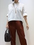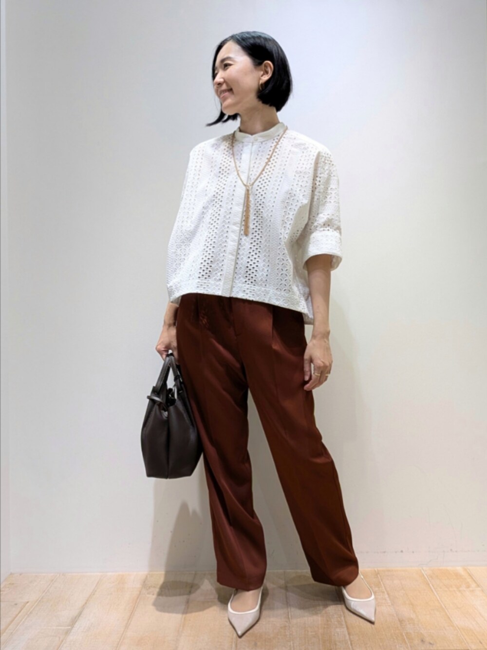 [プロフィール] 身長:164cm 骨格ウェーブ・ブルベ夏 普段サイズ:トップス38/ボトム38〜40 [qualite]レースハーフスリーブシャツ 着用サイズ:F しっかりとした硬い素材感の生地でジャケット感覚で立体的に着られます。レース生地でゆとりがあり風通りもよく真夏に合わせたいシャツジャケット。 [qualite]センタープレスカルゼイージーパンツ 着用サイズ:38 太すぎない筒幅のツヤのある着回しストレートパンツ。スッキリしていて、丈感の長いトップスもバランスよく合わせられます。薄く軽い素材感で暑い夏からきれいに履ける秋カラーパンツです。 [qualite]アソートチェーンタッセルネックレス 着用サイズ:F タッセルに様々な細かいチェーンを数種類合わせたボリュームの出せるロングネックレス。留め金のマンテルは2カ所あるため、長短2パターン楽しめます。アンティーク調のマットなゴールドカラー。