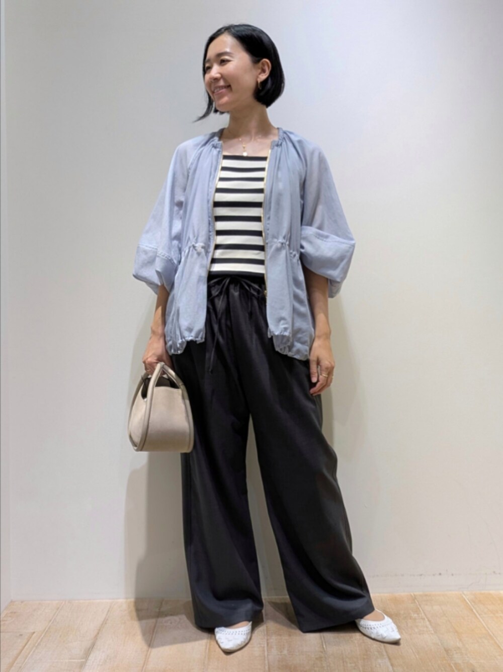 [プロフィール] 身長:164cm 骨格ウェーブ・ブルベ夏 普段サイズ:トップス38/ボトム38〜40 [qualite]ラウンドスリーブギャザーブルゾン 着用サイズ:F ゆったりしたフォルムのシアーブルゾン。袖口にはゴムが入っており、たくしあげると、よりふんわりした袖になります。また、ウエストや裾にもそれぞれゴムで調整ができ立体的に着られます。シアー素材で晩夏におすすめのアイテム。 [qualite]ウールライクイージーパンツ 着用サイズ:38 筒幅が広いワイドストレートでボディラインは見えないシルエット。ウエストは紐で調節可能なので、かなりゆとりがあります。見え方はウールのような質感ですが、接触冷感で、季節長く楽しめるパンツです。 [qualite]レーヨンストレッチニットノースリーブ 着用サイズ:F 安心感のある程よい厚みがあるぴったりしたシルエット。肩の生地が幅広なので絶妙に下着の紐が隠れます。ジャケットやシャツ羽織りの夏のインナーと最適な1枚。