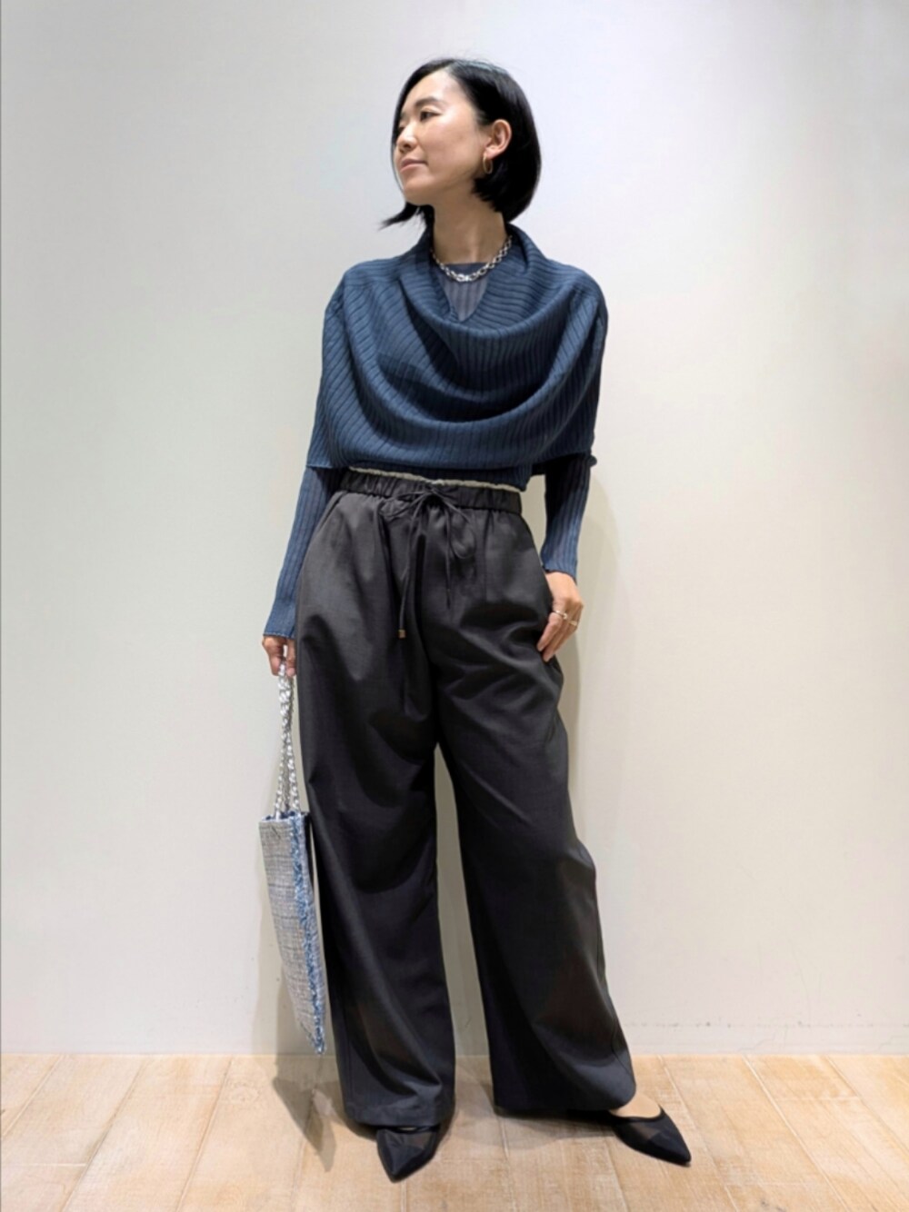[プロフィール] 身長:164cm 骨格ウェーブ・ブルベ夏 普段サイズ:トップス38/ボトム38〜40 [qualite]ワイドリブシアースヌードニット 着用サイズ:F 秋の始まりに欠かせないシアー素材のスヌード付クルーネックニット。華やかさもあり、スヌードが取り外し可能なデザインなので、スヌードを外してシンプルなクルーネックニットとしてジャケットのインナーに活用できるなどアレンジが効きます。 [qualite]ウールライクイージーパンツ 着用サイズ:38 筒幅が広いワイドストレートでボディラインは見えないシルエット。ウエストは紐で調節可能なので、かなりゆとりがあります。見え方はウールのような質感ですが、接触冷感で、季節長く楽しめるパンツです。 [qualite]ハクツイードバッグ 着用サイズ:F キラリと光る箔プリントを施したトートバック。美しいブルー✕シルバーカラーの生地で合わせるだけでコーデのポイントになります。 [qualite]ケーブルチェーンネックレス 着用サイズ:F ボリュームがありながらも、大ぶり過ぎず、女性らしさも忘れないチェーンネックレス。存在感がありますが、見た目より軽くてつけやすいです。