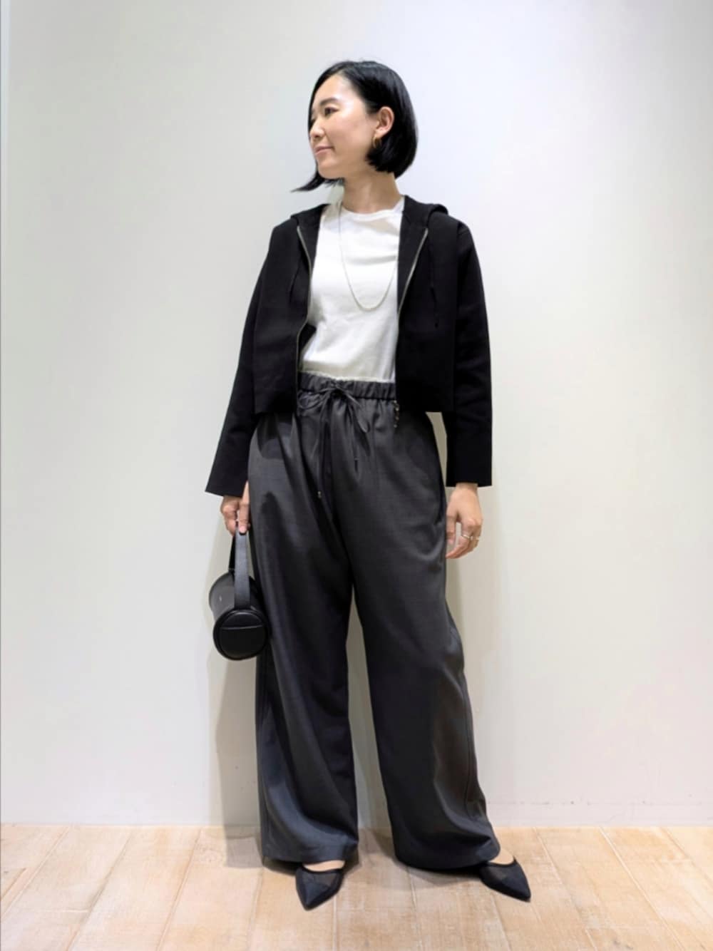 [プロフィール] 身長:164cm 骨格ウェーブ・ブルベ夏 普段サイズ:トップス38/ボトム38〜40 [qualite]フーディーニットブルゾン 着用サイズ:F もちっとした肌触りの良いがとても着心地の良いショート丈のブルゾン。コンパクトでワイドパンツや、ワンピースとの合わせがバランス◎カジュアルすぎないqualiteならではのフーディーブルゾンです。 [qualite]ウールライクイージーパンツ 着用サイズ:38 筒幅が広いワイドストレートでボディラインは見えないシルエット。ウエストは紐で調節可能なので、かなりゆとりがあります。見え方はウールのような質感ですが、接触冷感で、季節長く楽しめるパンツです。 [qualite]プレミアムプライスT 着用サイズ:F やや長めの半袖丈で、程よい厚みのある素材感の Tシャツ。ジャケットインやワンピースインの他、しっかりした生地のため1枚でも活躍します。