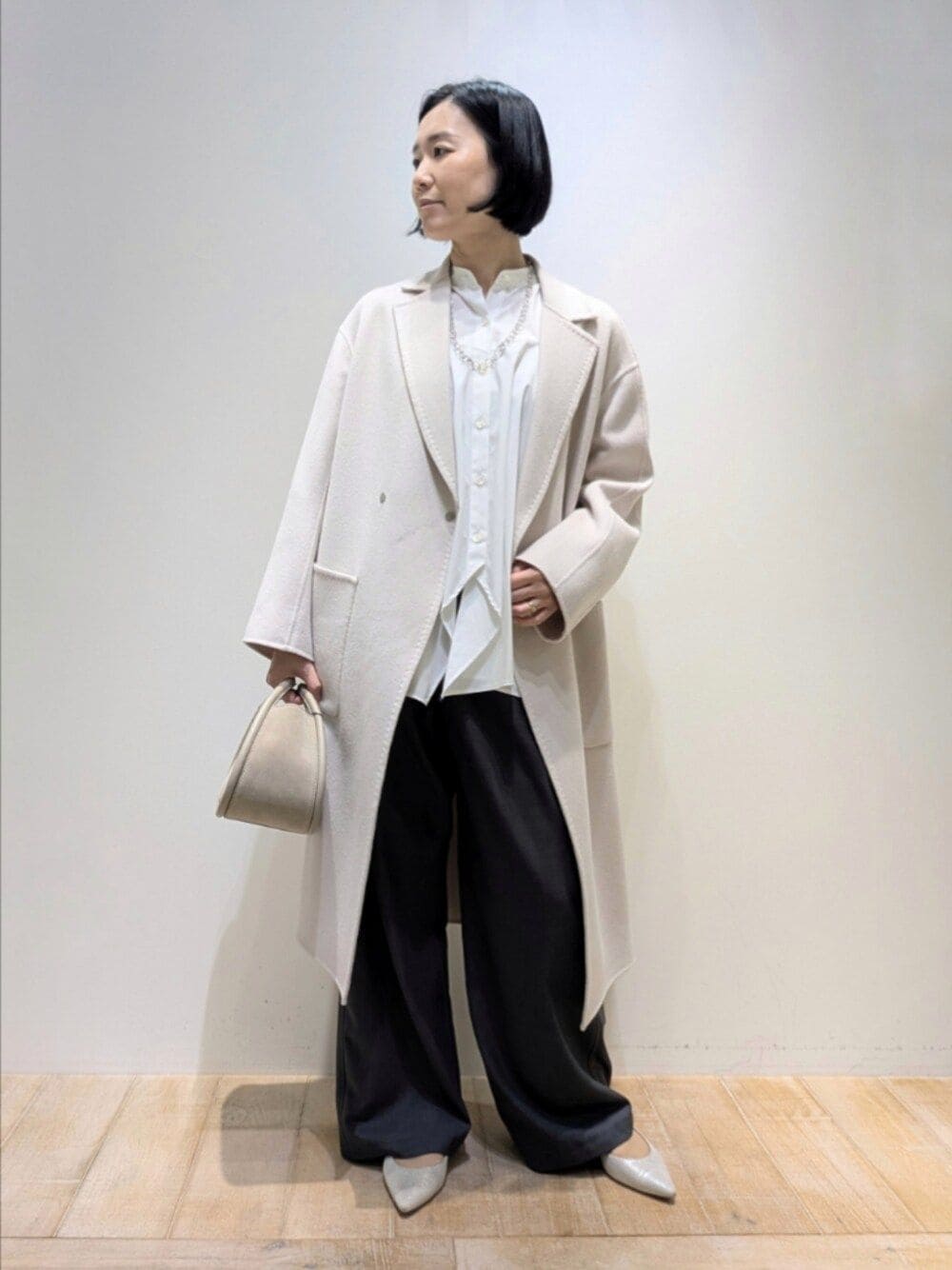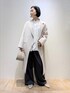 [プロフィール] 身長:164cm 骨格ウェーブ・ブルベ夏 普段サイズ:トップス38/ボトム38〜40 [qualite]ダブルフェイスチェスターコート 着用サイズ:38 ダブルフェイス生地のとても軽いウールロングコート。ゆったりしたサイズ感で、ジャケットもそのまま着膨れなく着られます。とても肌触りの良い上質な生地でできていて、長めな袖は折り返しても◎ [qualite]ランダムヘムシャツ 着用サイズ:F ジグザグとしたランダムフレアなデザインシャツ。丈が長くゆったりしたシルエットで、レイヤードスタイルにも活躍します。ハイネックニットを中に重ね合わせても◎ポリエステル100%でシワになりにくい素材です。 [qualite]ウールライクイージーパンツ 着用サイズ:38 筒幅が広いワイドストレートでボディラインは見えないシルエット。ウエストは紐で調節可能なので、かなりゆとりがあります。見え方はウールのような質感ですが、ポリエステルでシワになりにくく、季節長く楽しめるパンツです。