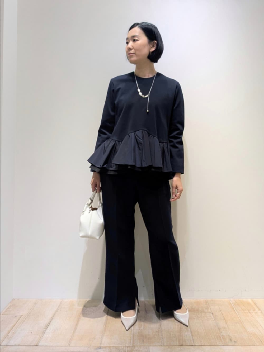 [プロフィール] 身長:164cm 骨格ウェーブ・ブルベ夏 普段サイズ:トップス38/ボトム38〜40 [qualite]タフタコンビプルオーバー 着用サイズ:F フェミニンなシルエットのコンビブルオーバー。ストレッチ性のあるポンチ生地で着心地よく、腰回りのタフタ生地は華やかさをプラスします。セレモニーにもおすすめなアイテムです。 [qualite]ライトダブルクロスベンツパンツ 着用サイズ:38 内側にサイドスリットのあるワイドパンツ。センタープレスがあり、脚のラインがきれいに見えるシルエット。厚みのあるダブルクロスの生地でシワになりにくくイージーケアなパンツです。