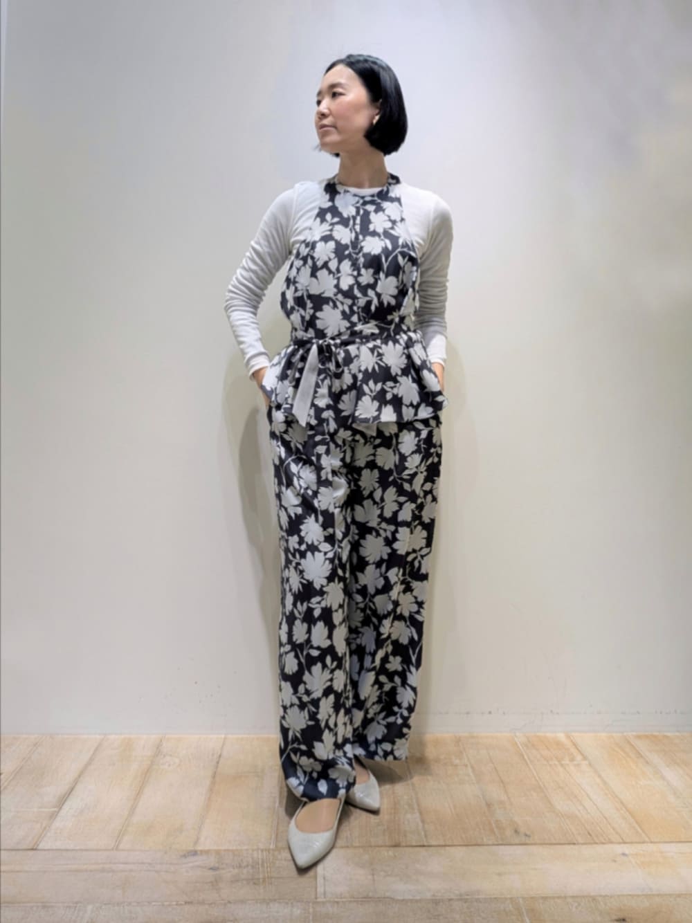 [プロフィール] 身長:164cm 骨格ウェーブ・ブルベ夏 普段サイズ:トップス38/ボトム38〜40 [qualite]シアーテレコロングスリーブT 着用サイズ:F さらっとした薄手のシアーリブカットソー。スタンダードなデザインで着回し万能なアイテムです。異なるカラー2枚重ね着しても◎細身ですがあまりボディラインに張り付かないきれいなシルエットです。 [qualite]シルエットフラワーホルターネック 着用サイズ:F オリジナルフラワー柄のホルターネック。ツヤのある生地でキレイさのある雰囲気。カットソーやブラウスとのレイヤードでイメージを変えて楽しめます。お揃いのパンツとのセットアップもおすすめです。 [qualite]シルエットフラワーパンツ 着用サイズ:38 オリジナルフラワー柄のワイドパンツ。 ボディラインの目立たない太すぎないワイドシルエットでウエストゴムの履き心地も◎ 合わせやすいモノトーンのフラワー柄で華やかさもあり、他のカラーアイテムとも合わせやすいです。