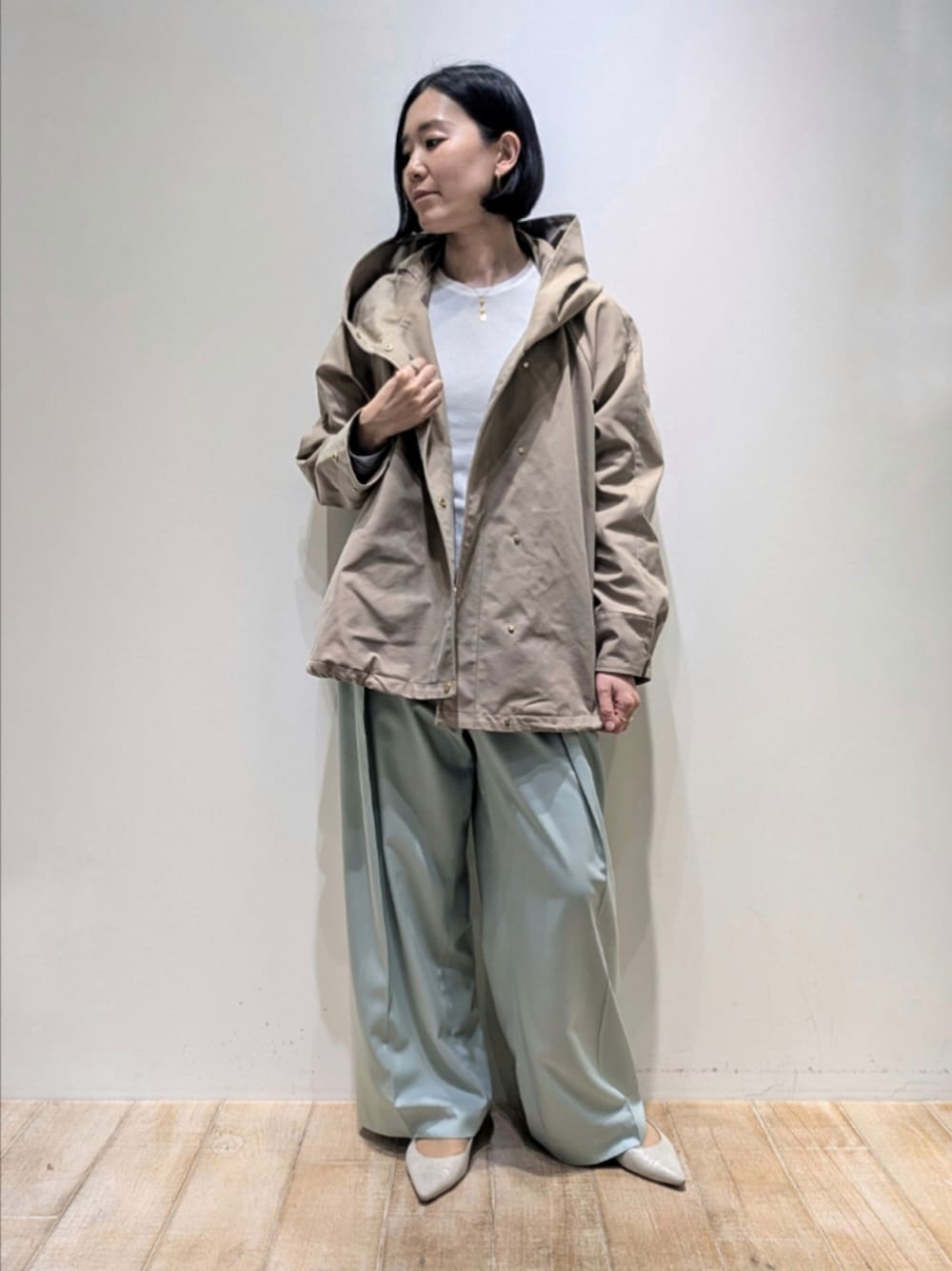 [プロフィール] 身長:164cm 骨格ウェーブ・ブルベ夏 普段サイズ:トップス38/ボトム38〜40 [qualite]タスランストレッチフードブルゾン 着用サイズ:F ハリのある素材感で立体的に着られる春のブルゾン。ゴールドカラーのスナップで、品があります。カジュアル過ぎない大人のフーディーブルゾンです。 [qualite]シアーテレコロングスリーブT 着用サイズ:F さらっとした薄手のシアーリブカットソー。スタンダードなデザインで着回し万能なアイテムです。異なるカラー2枚重ね着しても◎細身ですがあまりボディラインに張り付かないきれいなシルエットです。 [qualite]テンセルハイツイストワイドパンツ 着用サイズ:38 薄手の滑らかな生地のようなパンツ。タックの入った太めのワイドストレートで、ボディラインはカバーしてくれます。センタープレスが入っておりすっきりしたイメージで履けます。
