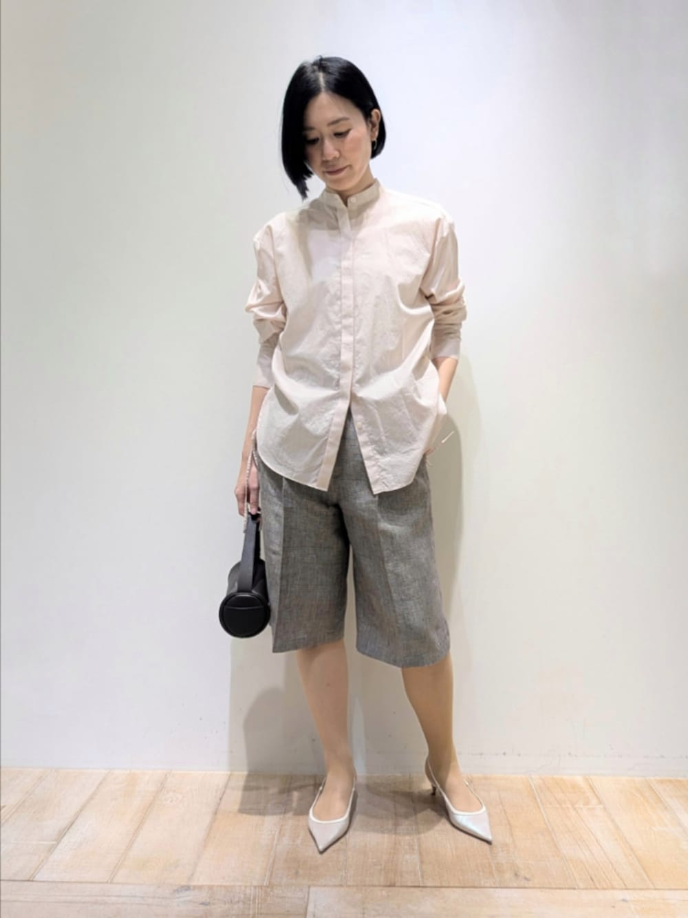 [プロフィール] 身長:164cm 骨格ウェーブ・ブルベ夏 普段サイズ:トップス38/ボトム38〜40 [qualite]ウエストドロストシャツ 着用サイズ:F コットン100%の薄手シャツ。サイドの紐の調節で、1枚でも立体感が感じられます。羽織りでも活躍するので様々なシーンで活躍するシャツです。 [qualite]ラメリネンショートパンツ 着用サイズ:38 腰回りゆったりしたシルエットショートパンツ。膝が出ない大人のショート丈で、上品に着られます。ラメ糸が織り込まれた素敵な生地。