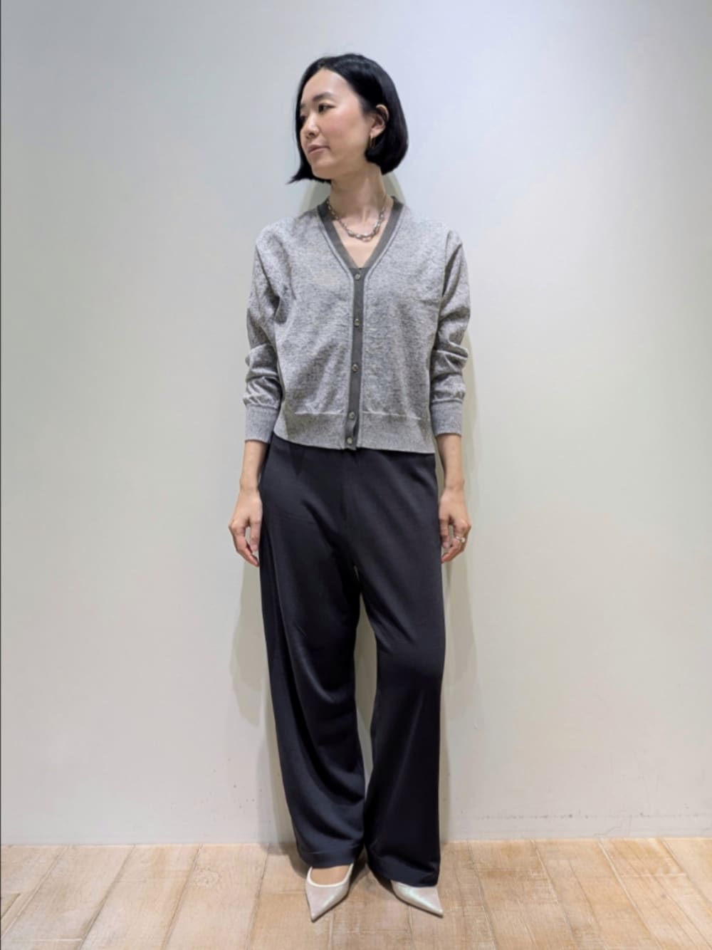 [プロフィール] 身長:164cm 骨格ウェーブ・ブルベ夏 普段サイズ:トップス38/ボトム38〜40 [qualite]シアーミックスカーディガン 着用サイズ:F 軽やかな素材感のカーディガン。金属ボタンを使用し、襟回りからシアー素材をプラスして華やかさがあります。差し色で肩がけも◎薄手なので、シーズン長く活躍します。 [qualite]レーヨンストレッチニットパンツ 着用サイズ:38 ボディラインを拾わないニットパンツ。落ち感がありすっきりしたきれいなシルエット。接触冷感素材なので、真夏でも快適に履けます。