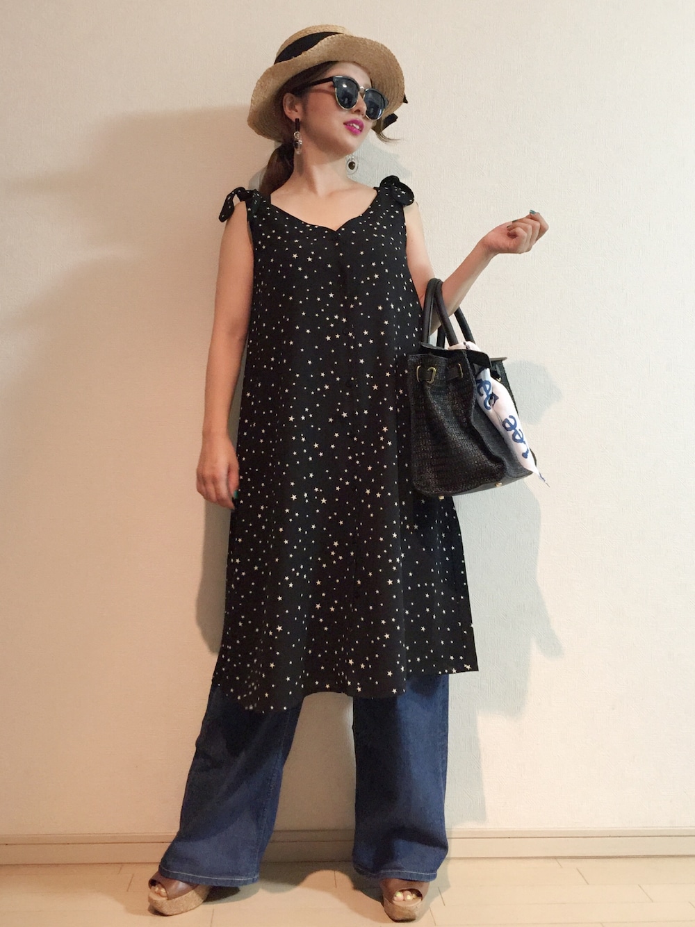 こんにちは🤗Leeのハイウエストバギーパンツの着回しコーデです👖💙💙 今回はワンピースに合わせてみました😁💜ワンピースの裾から見えるデニムのフレアなラインが綺麗です😊💙💙 星柄の肩のリボンがめっちゃかわいいワンピース👗みやびちゃんが着ててめちゃくちゃ可愛かったやつ👗💜💜裏地付きでサラサラだよ~🙂🙂大型店かオンライン限定なのでご注意を🙇🙇 カゴバッグには、Leeのサロペットについていた、バンダナを結んでみました😌😌 Instagram ➜ hama.chie コーデのポイントやら、買ったものやら載せてます😍プロフィールからリンク貼ってます!アカウント作ったばかりなので、みなさんフォローよろしくお願いします😭💜💜