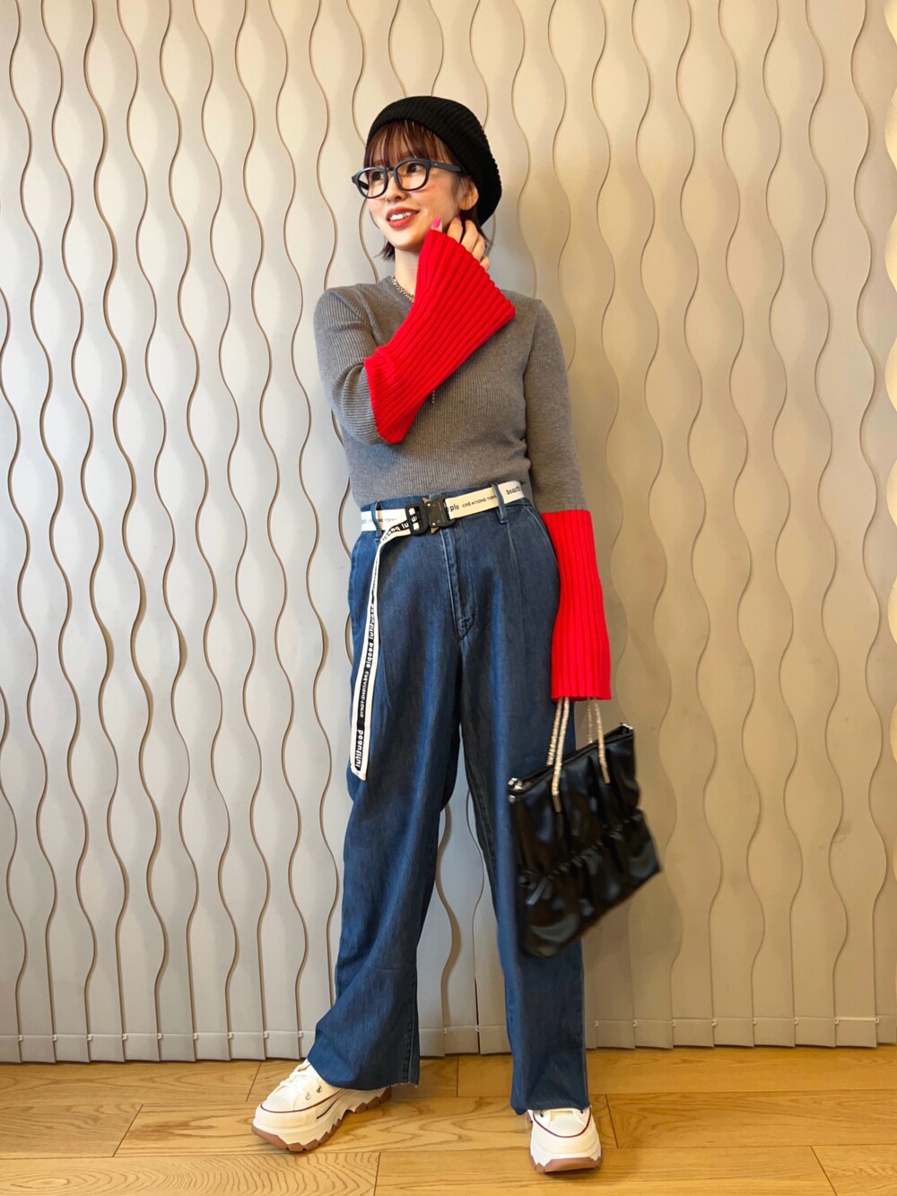 グレーと赤の組み合わせが大好きで、 このニットは可愛すぎる🤦♀️♡ ワイドデニムと合わせて♡フレンチガール🇫🇷 Instagram ⇒@hama.chie