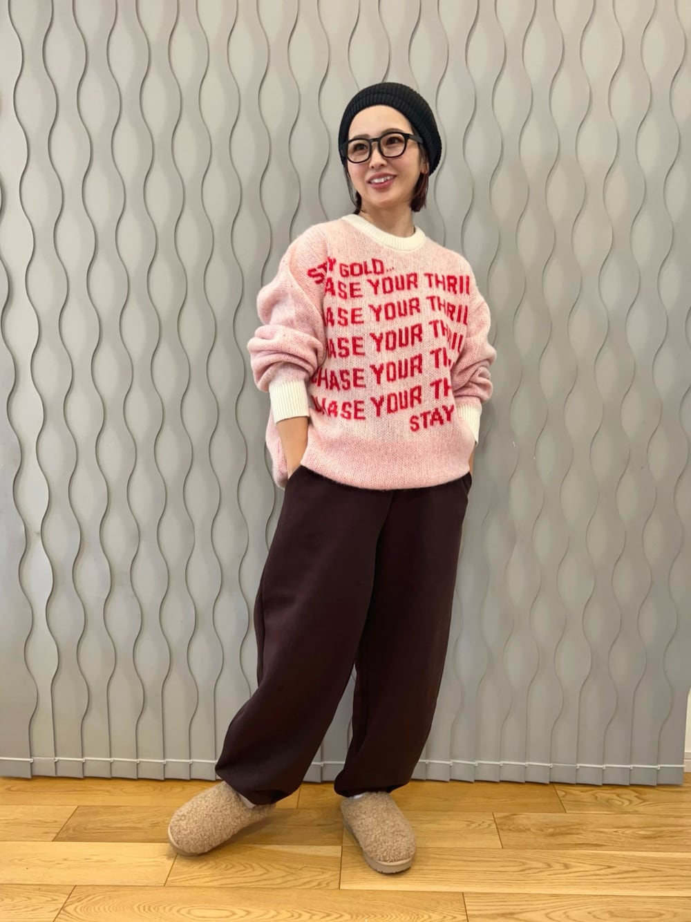 最近買ったお気に入り♡ ゆるっとサイズ感がかわいいニット♡ メッセージロゴのtops昔から好きで、ニットタイプめっちゃ珍しいって思ってひとめぼれ(¨)♡ 冷え込む日続くようなので、 皆様お気を付けて☃️*⌇ 𝕝𝕟𝕤𝕥𝕒𝕘𝕣𝕒𝕞 ▷▶︎@hama.chie