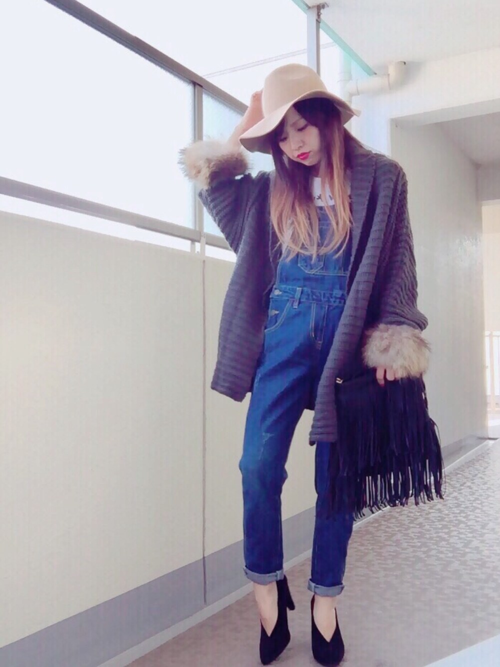 まゆみちゃんがサロペット着てたので…あたしも⁽⁽ૢ(⁎❝ົཽω❝ົཽ⁎)✧♡ 久しぶりのサロペット…♡ やっぱりしっくり♡ 今日はフェルトハットにファー付きのニットガウンと合わせてレディな感じに…(*゚∀゚*)
