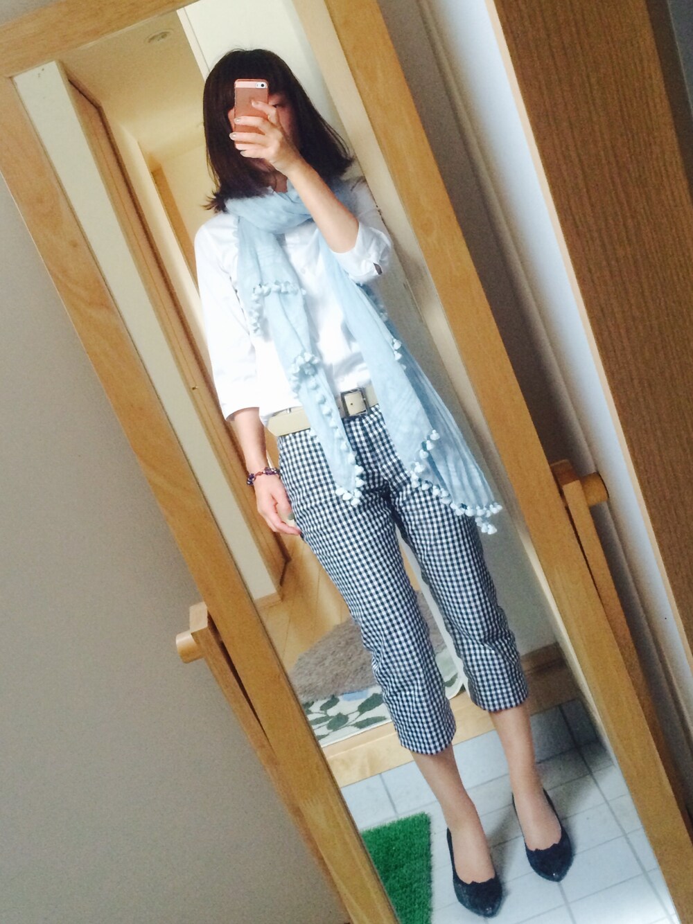 シャツ:UNIQLO パンツ:URBAN RESACH ストール:RIVE DROITE