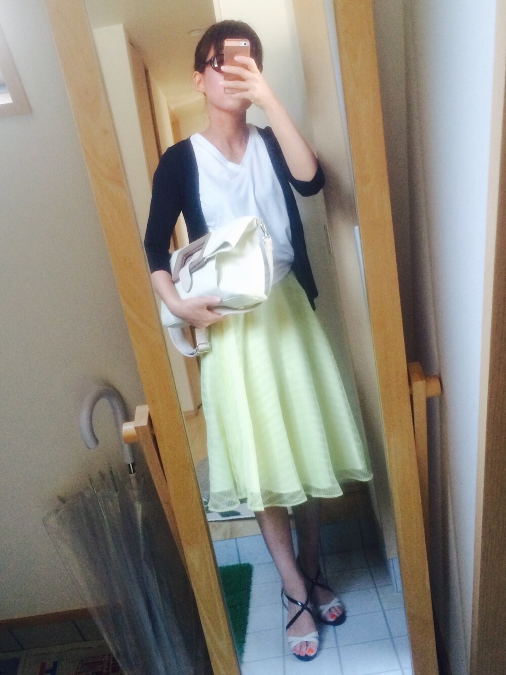 黒カーディガン:? 白Tシャツ:PLST スカート:マーキュリーデュオ クラッチバッグ:パピオネ