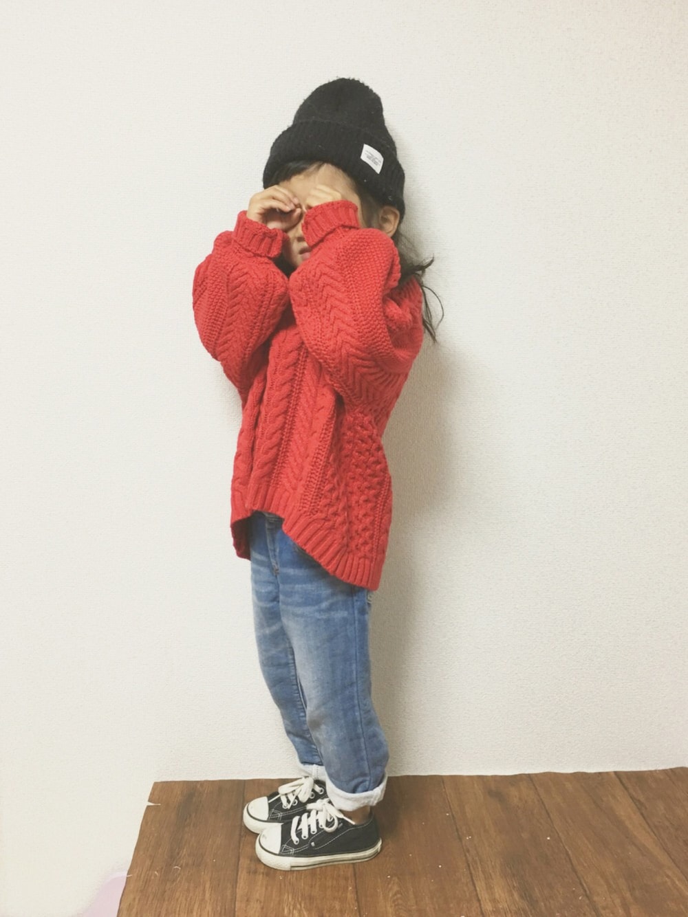 オシャレキッズちゃん達の影響でうちも赤ニットget♡ ちょっと大きめやけど可愛い〜◎