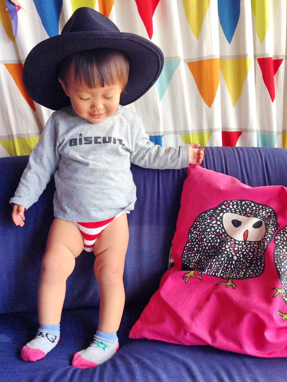 ママの帽子かぶって ズボンは履いてくれません。