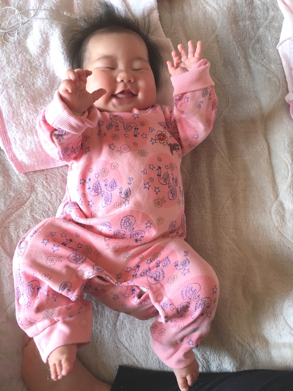 頂き物のピンクのロンパース。 着させた途端この笑顔。 やっぱり女の子やなぁ( ˘ ³˘)♥ ゚+。:.゚