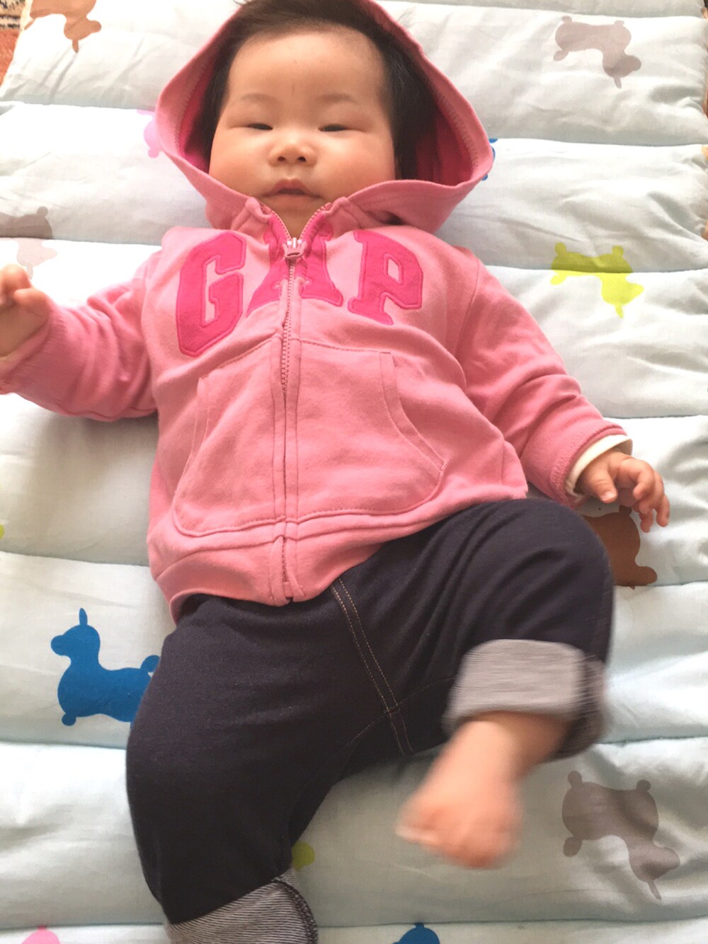 初めて服を着せました うちの中にある一番着せやすい服👗 動いて写真が撮れん。 ロンパース卒業ー😂オメデトウ〜