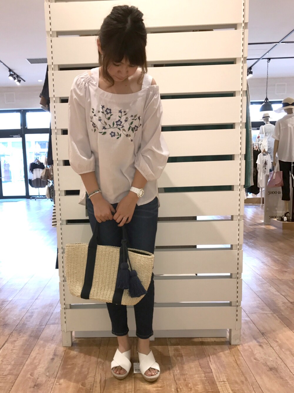 チエのシャツ/ブラウス「◆ストライプ刺繍オフショルダーブラウス」を使ったコーディネート