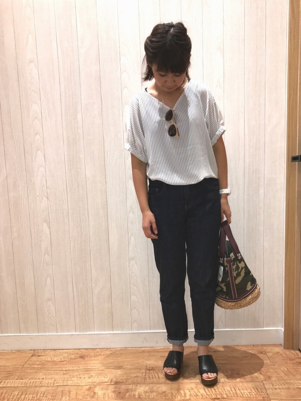 こんにちは* 袖が可愛いストライプカットソー♡ ¥1620とプチプラです☺️ 前だけストライプのジョーゼット素材で 後ろは無地のカットソー素材なので カジュアル合わせしやすいです👖♫