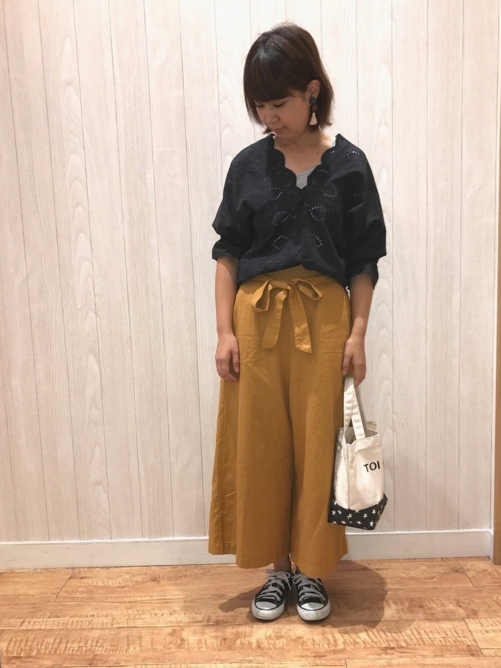 おはようございます* スカラップブラウスの黒も可愛くて 着てみました🐻★ ワイドパンツも コットン×麻素材が今の時期にちょうどよく 落ち感もきれいです✨ ちなみに上下とも購入しました☺️ ただいまシューラルーでは コラボ企画といたしまして 店頭でアロマジュエルの試供品を お配りしております☺️💓 ぜひご来店下さいませ♫