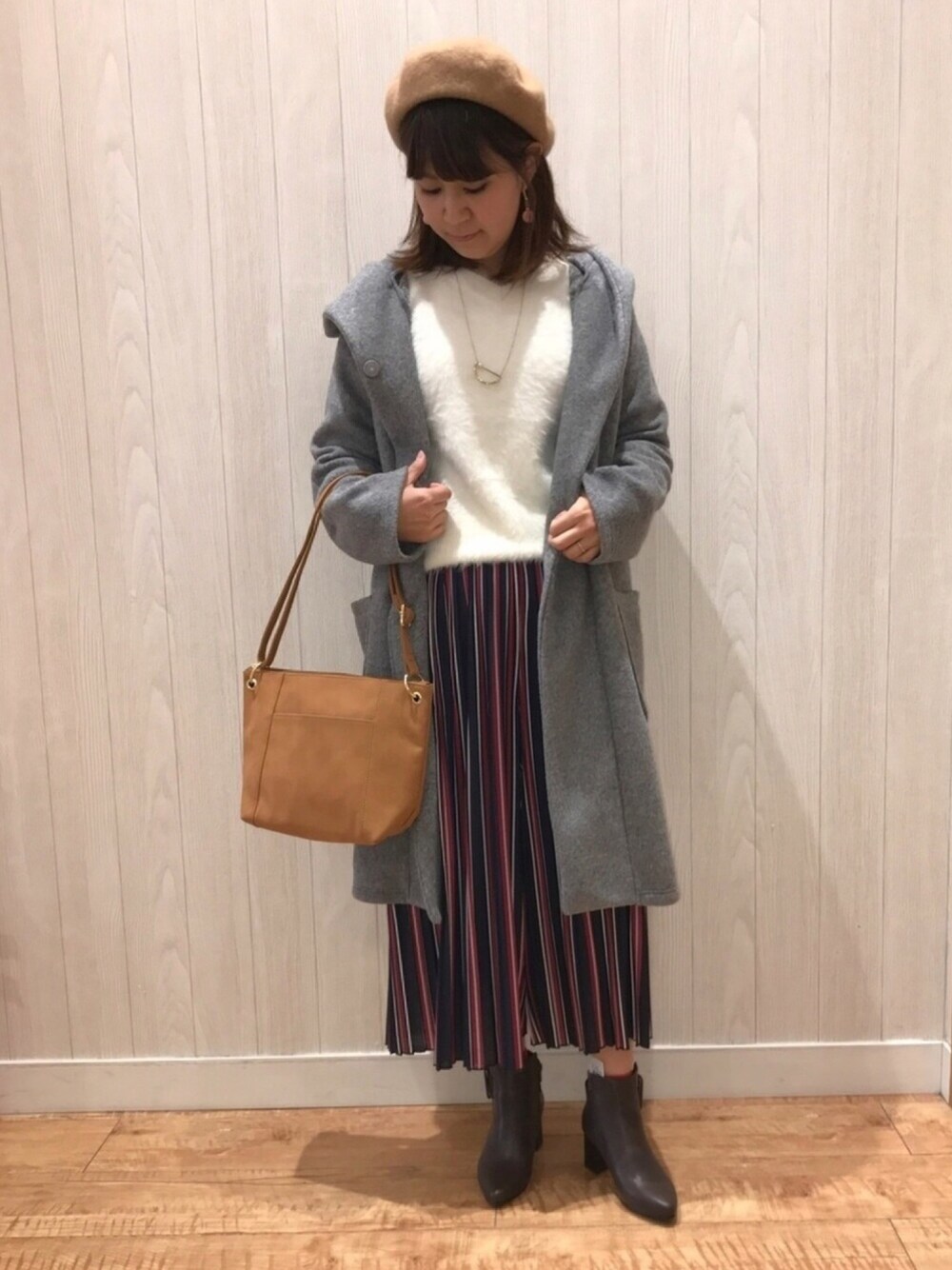 こんにちは* フェザーニット×プリーツスカンツ♡ ニットは地厚でとても暖かいです。 白だけどお腹に貼ってるホッカイロが 透けてないのがその証拠です笑 ボトムスはすそくるスカンツの新作の ストライプ柄です🐼 色違いのライトブルーも可愛いですよ♡